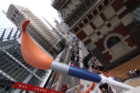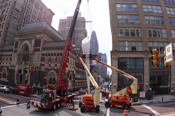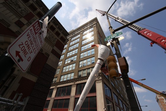 On Saturday, Lenfest Plaza took one step closer to completion with the installation of Claes Oldenburg’s sculpture, Paint Torch. From the looks of it, considerable progress has been made at this site since our last update. Check the our mini-gallery of the installation. Photos are by Sean Tucker.