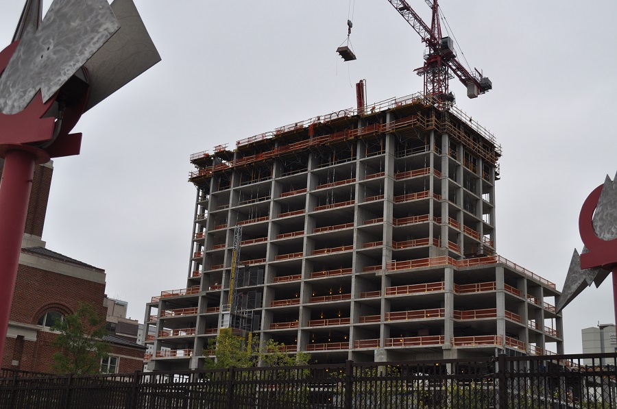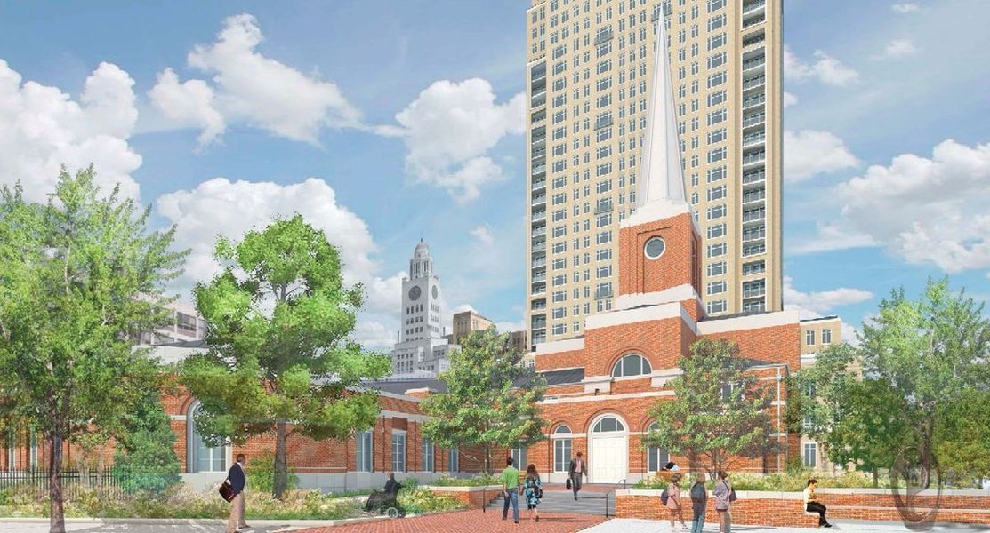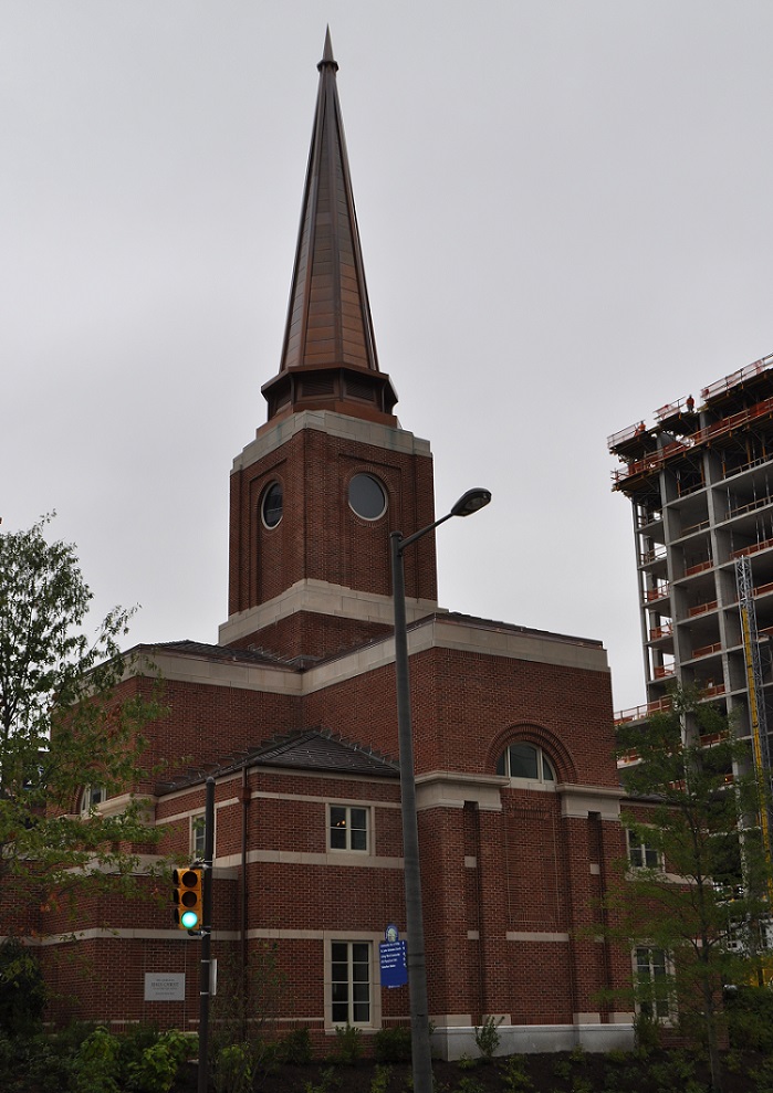 The obvious difference here is that the steeple in the drawing looks white while the steeple is copper. When we reached out to the church to find out why they changed the design, they said, “The copper steeple, gutters and downspouts are more authentic and aligned with the historical brick and dark roof. In time, the shiny copper will turn a pale green (patina) to make the building look like it's been in Philadelphia a long time.” What an amazing concept, changing the design from rendering to reality by making the materials more expensive! Hold on, we need to catch our breath. It's been great to see a developer spend a lot of time and money on this quality project. We encourage everyone to book a tour of the building. In the future, we'll look forward to the completion of the neighboring 375 foot apartment tower starting to take shape next door, also devleoped by the LDS church.