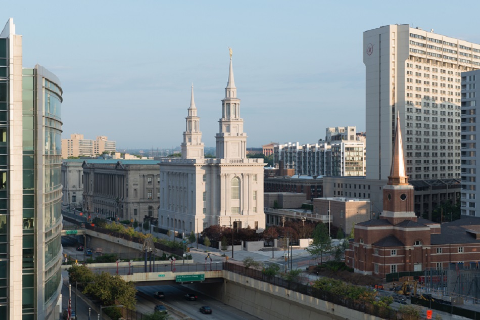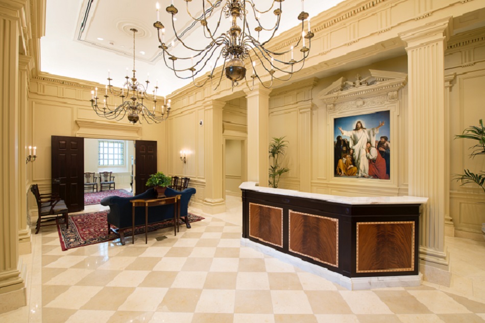 The brand-spankin’-new Philadelphia Temple of The Church of Jesus Christ of Latter-Day Saints (LDS) is really a sight to behold. With its soaring spires (208 feet high), grey granite facade, and neoclassical exterior architecture, it completely sticks out among the various new buildings being built in our fair city. Indeed, a building of its stature is more likely to be demolished these days than be built. And yet, the LDS (AKA Mormon) Church meant first and foremost for this building to fit its regional surroundings. They wanted it to look like it has always been here. Its neoclassical exterior matches the neighboring former family court and Free Library in roof height and style, although it differs significantly in color. The spires and the interiors are meant to harken back to the Georgian era in which our country was founded.