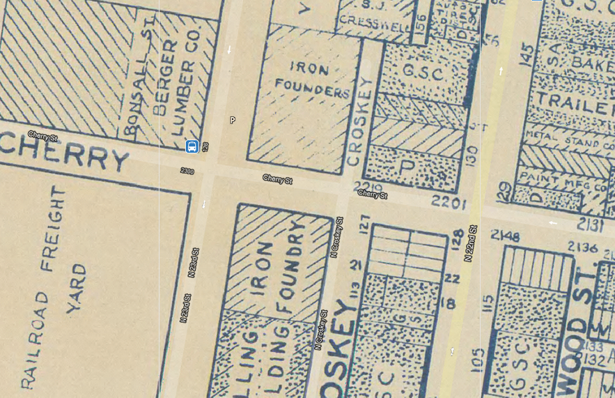 113-27 N 23rd St. has been owned by Herbert and Esther Samuel since at least 1953. The building (or really the collection of buildings) was part of an iron works facility that was also located across the street, where the Cherry Street West homes were going to be built. According to a couple of land use maps from the 20th century, the iron works stopped using the buildings between 1942 and 1962, possibly when the Samuels purchased the structures.
