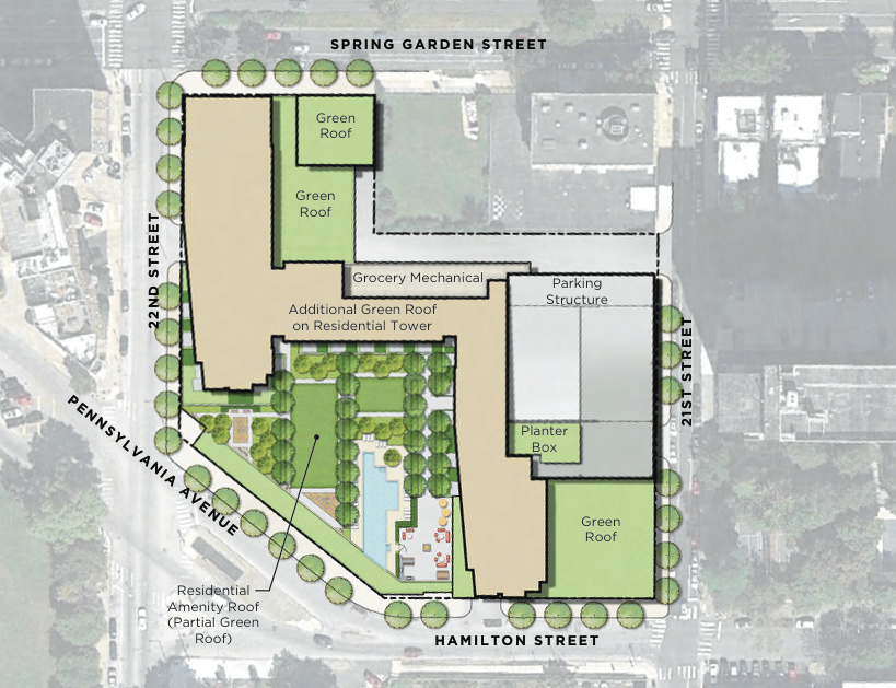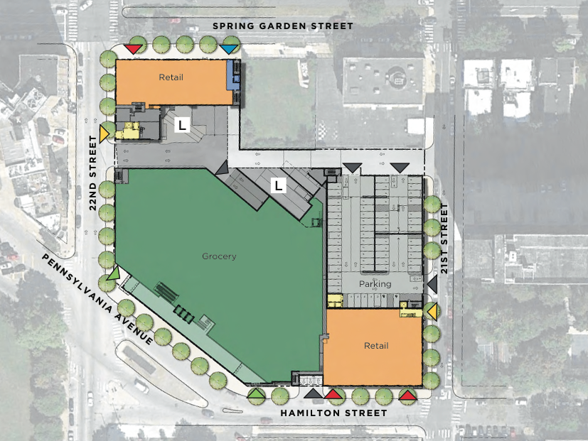 Over the winter, we told you about plans for Whole Foods to move out of their too-small, parking-nightmare location at 20th & Callowhill to a new facility to be constructed at 22nd Street and Pennsylvania Avenue, currently the site of a Best Western Hotel. We knew that this would be a mixed-use development, and that it would be massive, but we’d gotten relatively few specifics about this project. Until now, that is. A couple of weeks ago, the developers presented the project to Civic Design Review, providing all sorts of info and pretty pictures too!