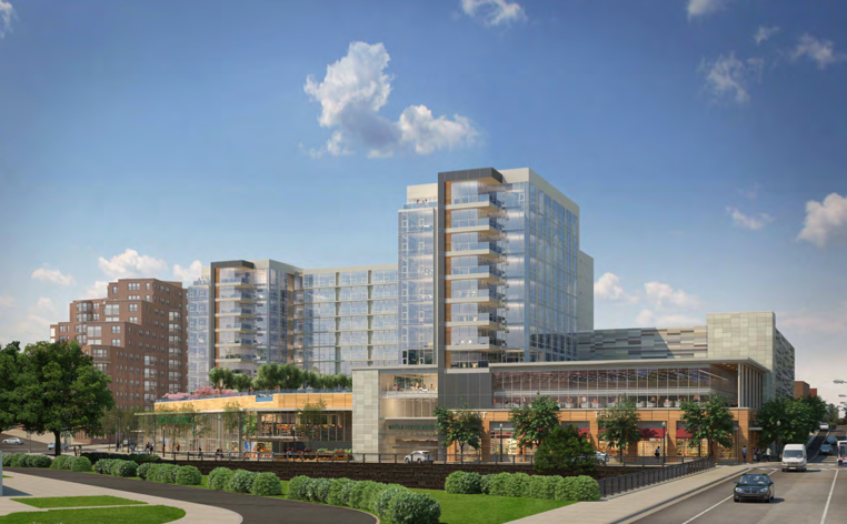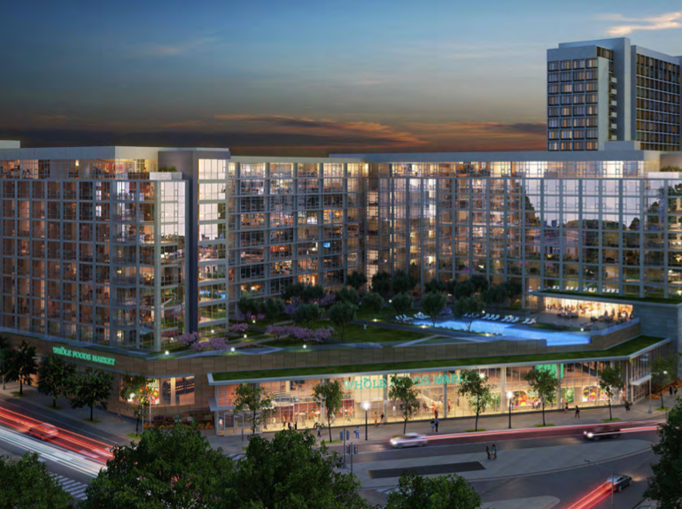In addition, the development will include 293 apartment units over nine stories. These residences will have parking in an adjacent garage, which will also have parking for bicycles. In addition, there will be a huge amenity space for folks who live here, located on the roof of the Whole Foods. There will be a swimming pool, green roof areas, and spots for meeting and exercising.