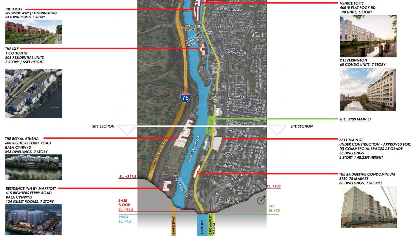 While this is across the street from another 36-unit project that’s planned, we are honestly surprised to see a project like this so close to the river. The development team will need a variance to build within the flood plain, which is both understandable and something we’ve seen before. What we haven’t seen is the inclusion of underground parking. It was less than two years ago that Hurricane Ida overflowed the banks of the Schuylkill River and flooded everywhere from Conshy to Center City. As you can see in the video below, this 100-year flood completely covered the area where this project is proposed, so we hope that folks have good flood insurance if they’re planning on keeping their car in the underground parking area.