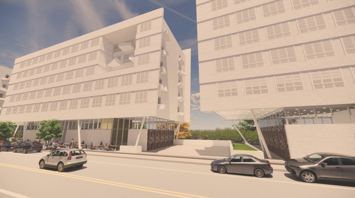 The design from SgRA is a modern, bright take on the five-over-one approach that we see so often. In this instance, the design team created a light, airy ground floor, with V-shaped supports breaking up what would otherwise be a very heavy massing. The white brick and lighter color choices also make the project almost seem like it’s floating above the ground level, which will provide landscaping and access to a future riverfront path. We are pleased to see nearly 20K sqft of commercial space here, ensuring that there should be plenty of reason for folks who live nearby to make their way down here.