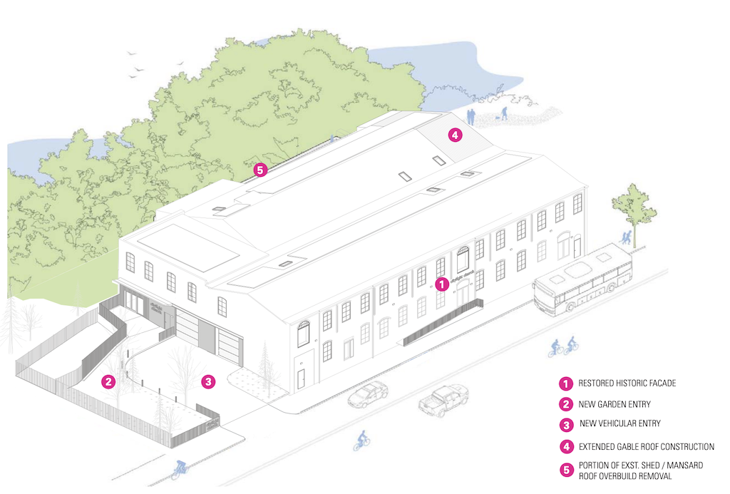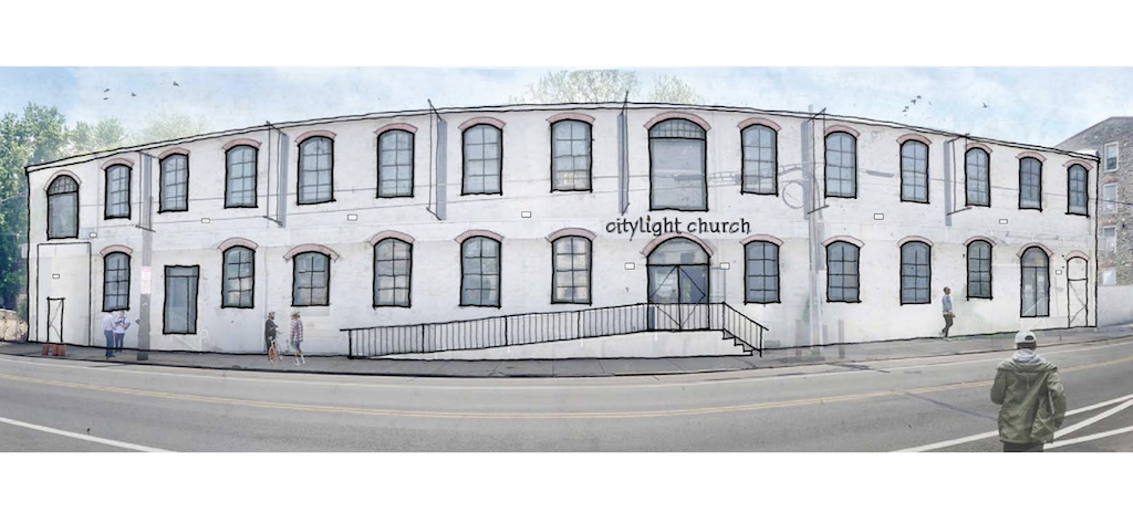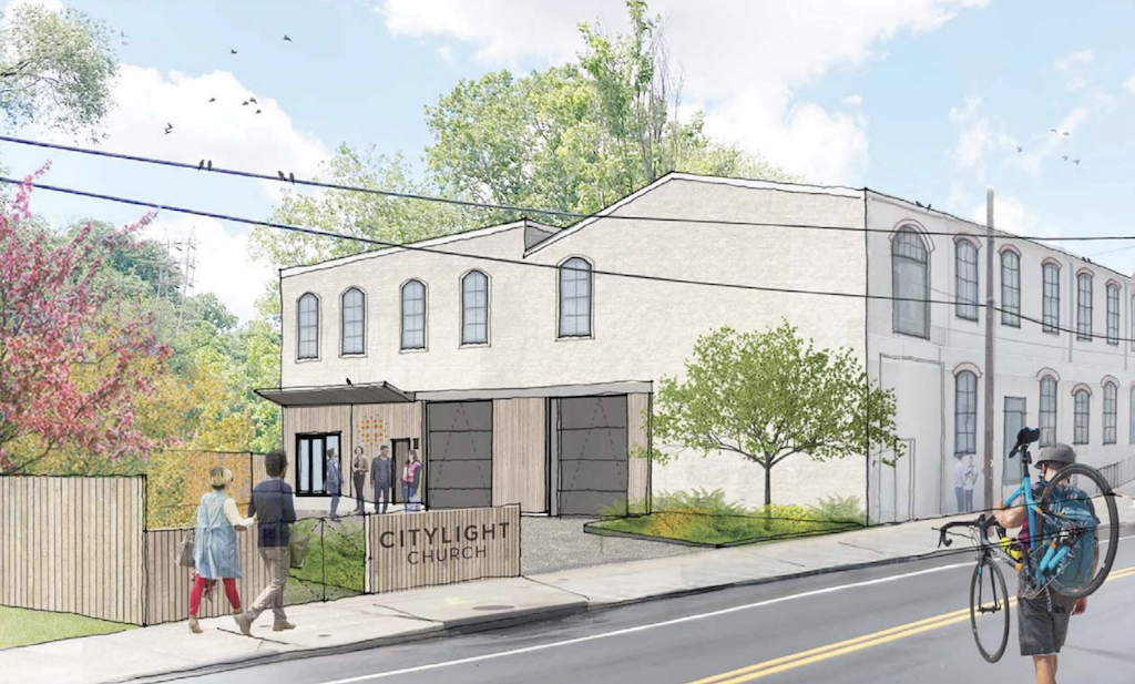 Not so fast! Citylight Church, which has had a presence in Manayunk for the last decade or so, bought the property last year. Their vision is to convert the existing building on the site into their new home. They retained Bright Common Architecture to come up with a plan to reuse the historic building for their purposes. The plans call for a large sanctuary, gathering spaces, and offices on the upper floor. Thanks to the fact that the building sits in a flood plain, the first floor would be used almost exclusively for parking. Check out the renderings!