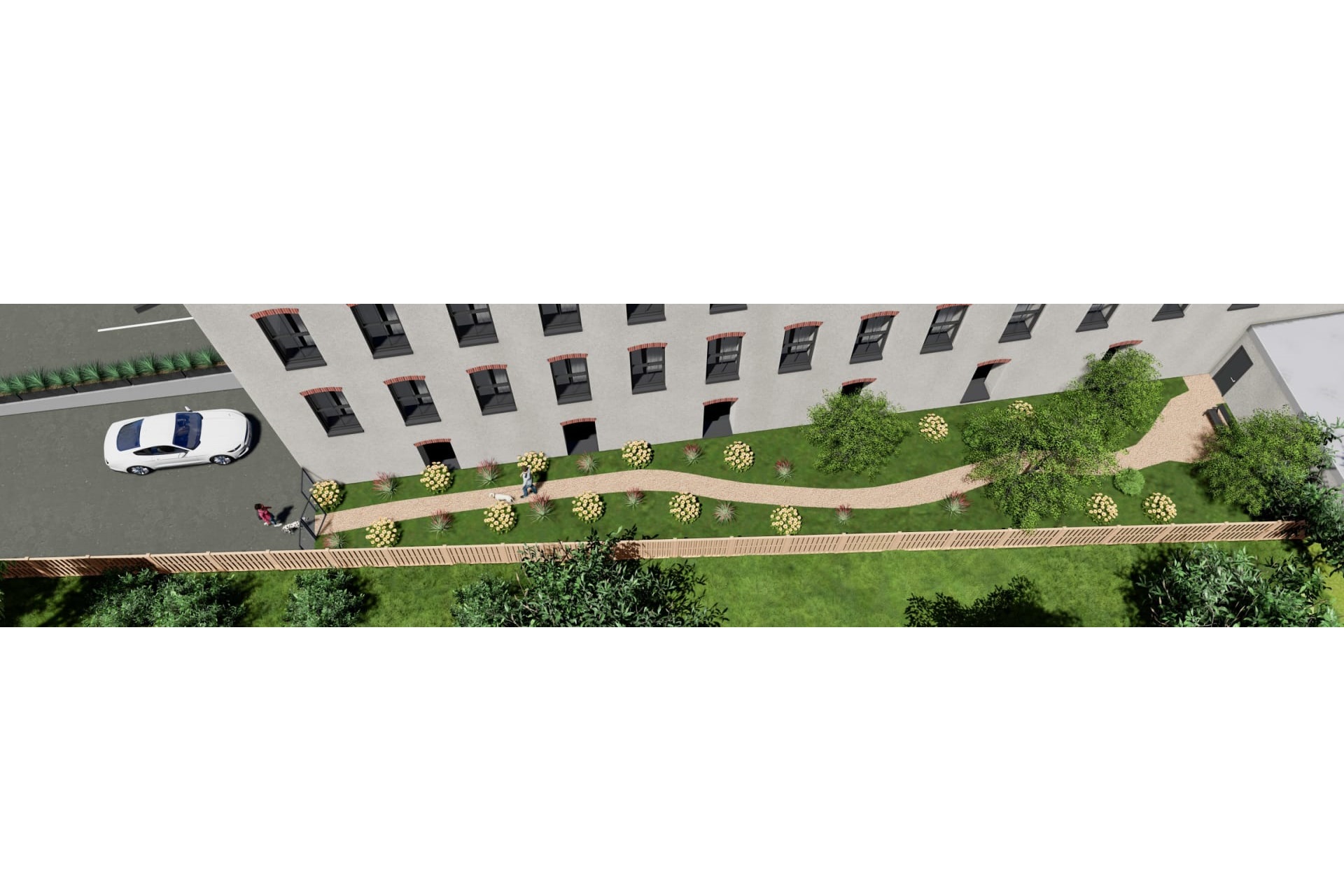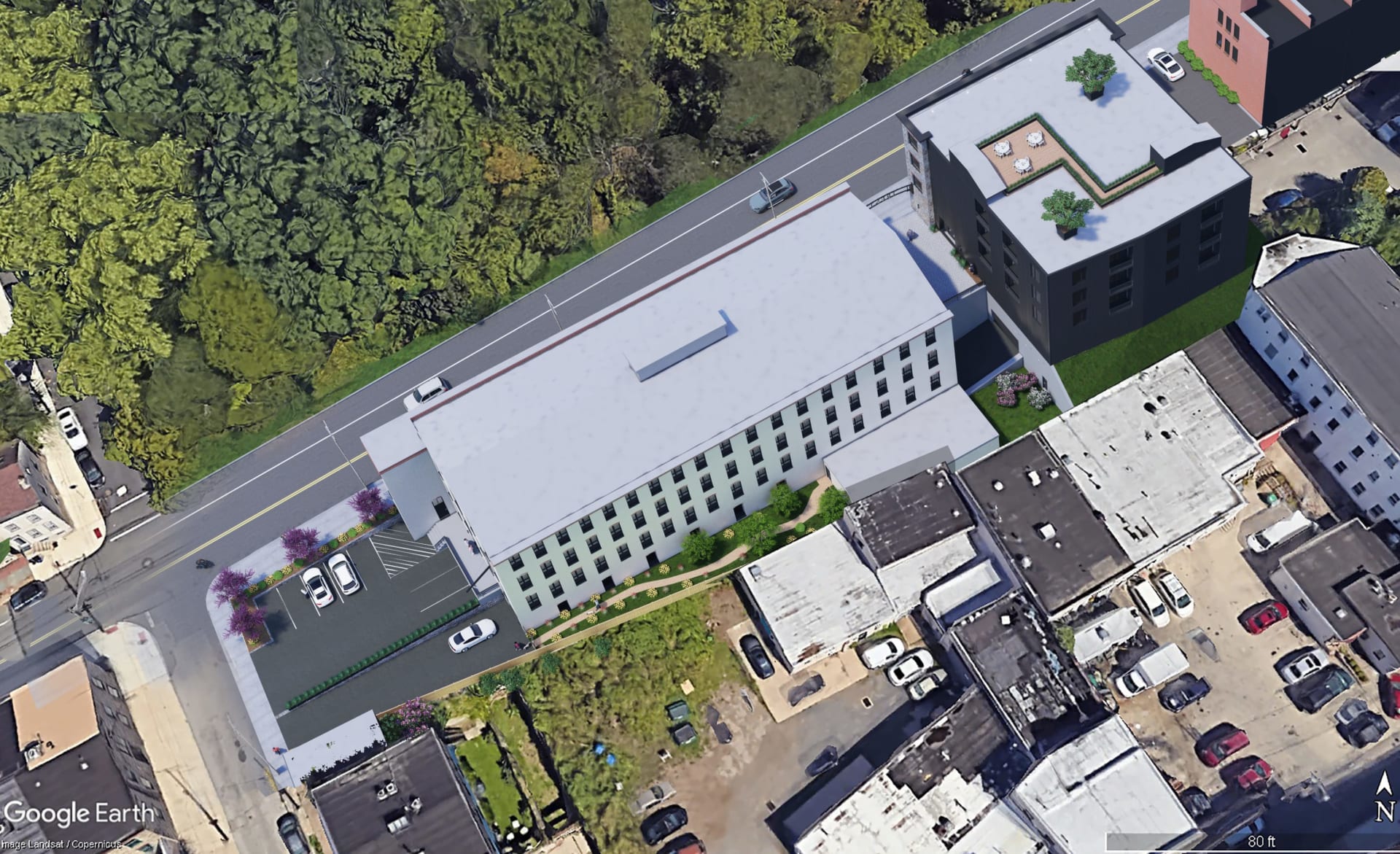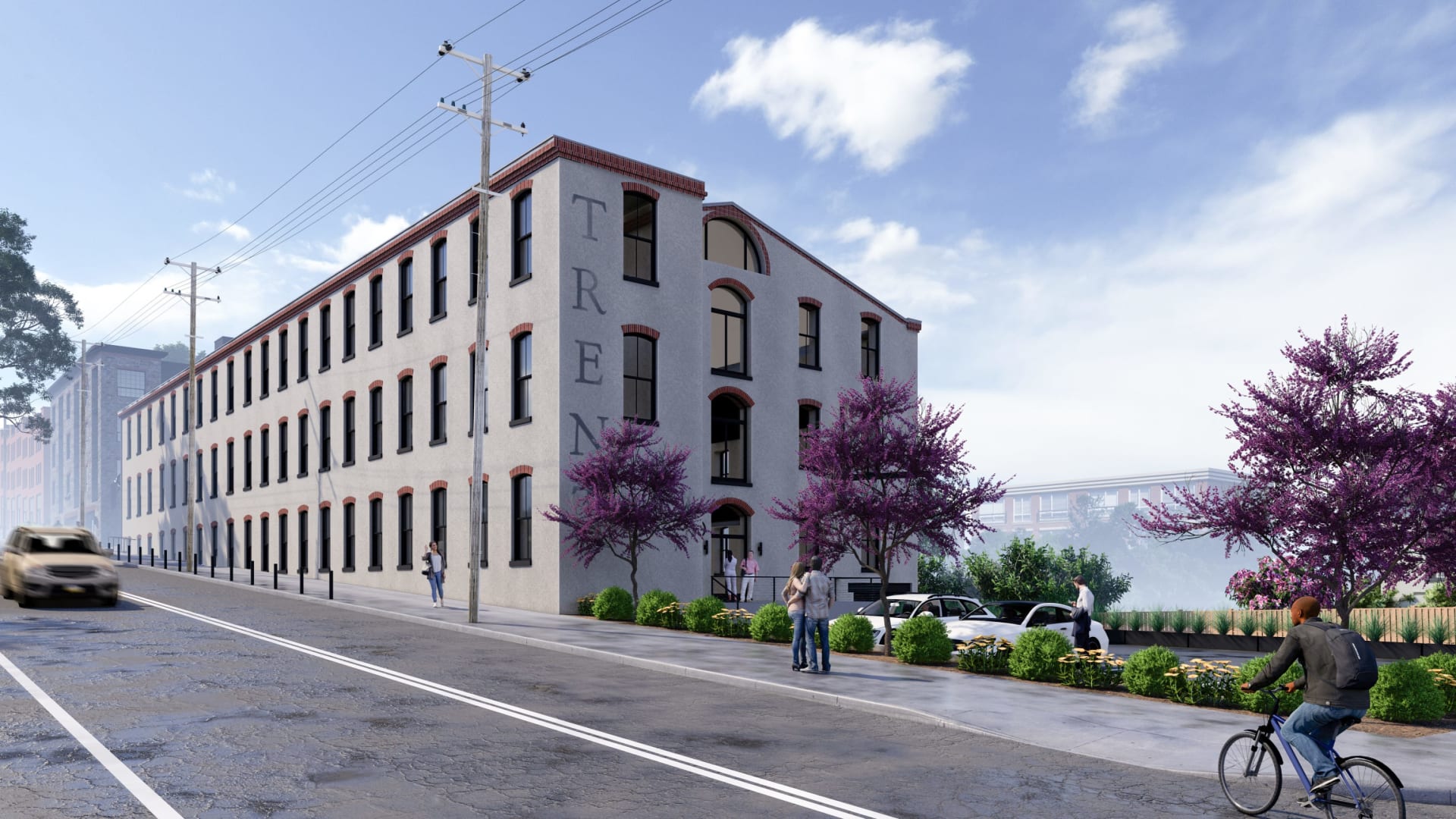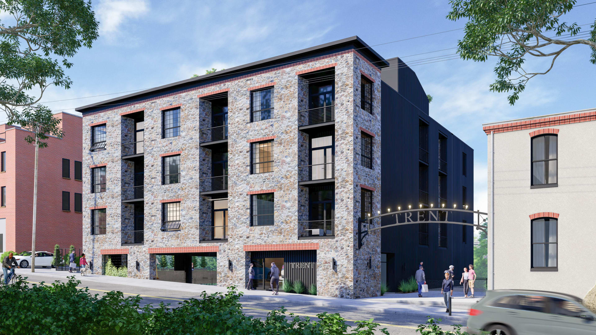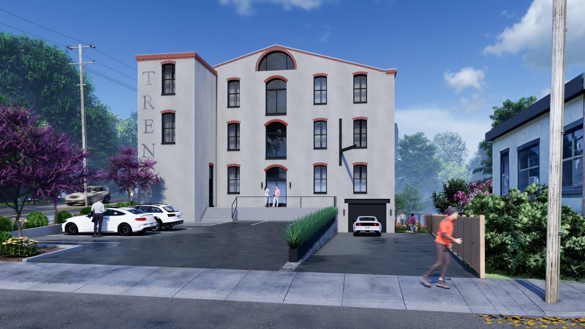 After perusing the zoning docs, we saw that Studio C Architecture is handling the design here, working with Baker Street Partners, per that sign in the earlier photo. And when we did a little further digging, we were happy to discover there are plenty of renderings for the proposed project, which is called the Trent, seemingly as a nod to the last occupant.