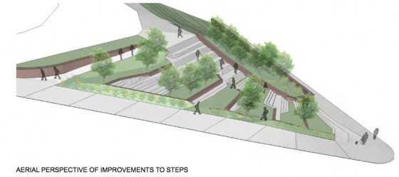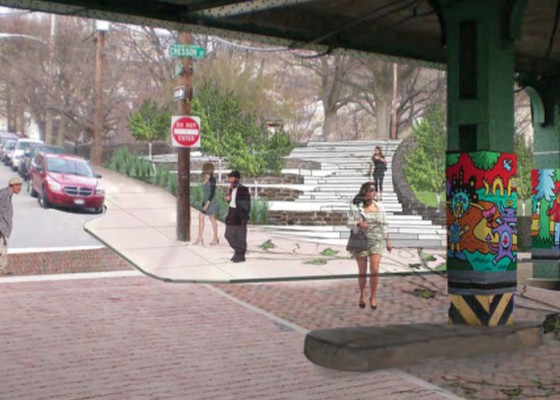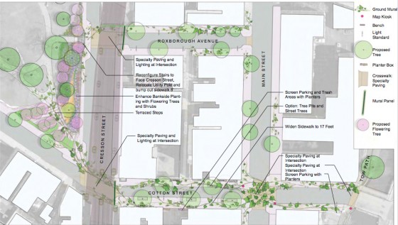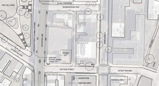 Community Design Collaborative has come up with a number of recommendations for improving visibility of the park, access to the park, and the pedestrian experience approaching the park. The most interesting improvements involve regrading the entrance to the park at the corner of Cresson and Cotton Sts., which represents the park’s most logical access point from the south.