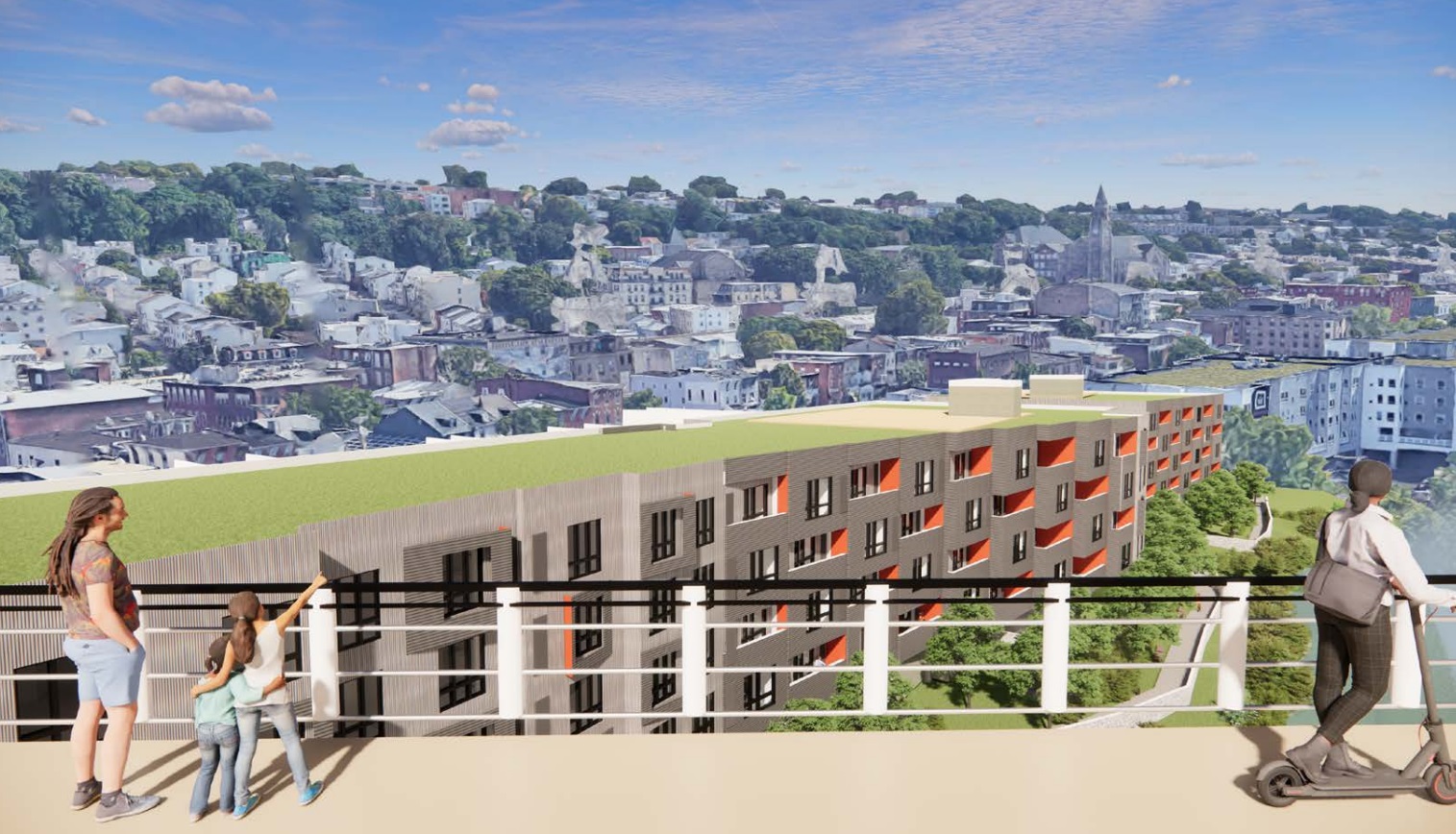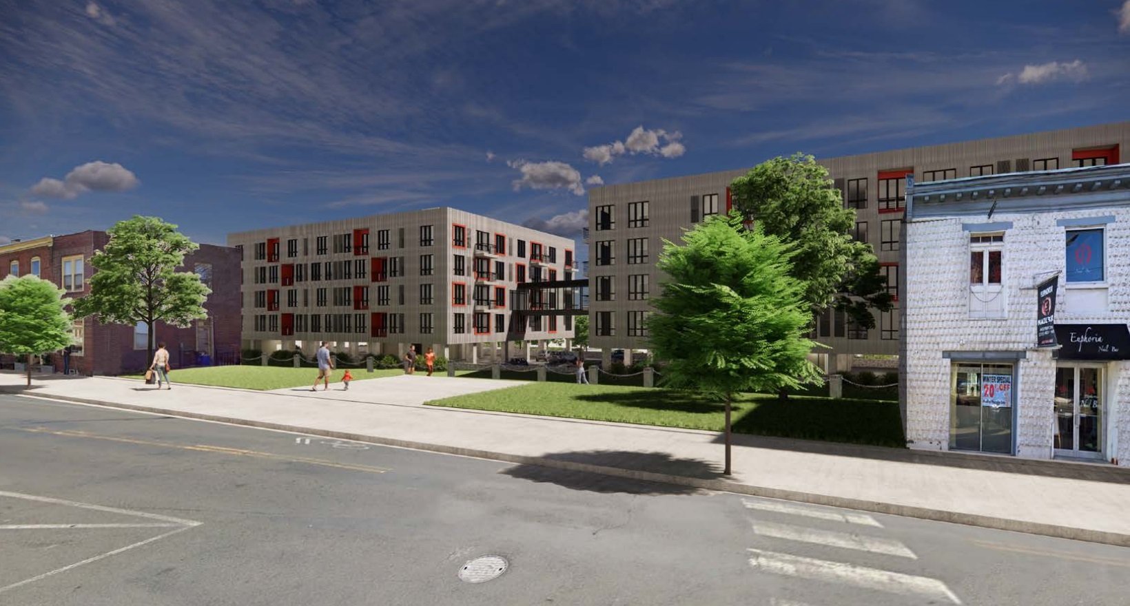 As for the design itself? The two new apartment buildings will feature corrugated metal panels broken up by hits of terracotta-colored panels, with the westernmost building nearly double the size of the smaller, eastern building. The amenity/retail building along Main St. will also get a revamp, with a much more modern look taking the place of the traditional rowhouse currently standing. The green roof on both new buildings will also provide additional visual interest from the Manayunk Bridge Trail that crosses overhead.