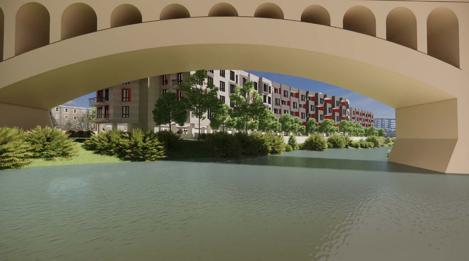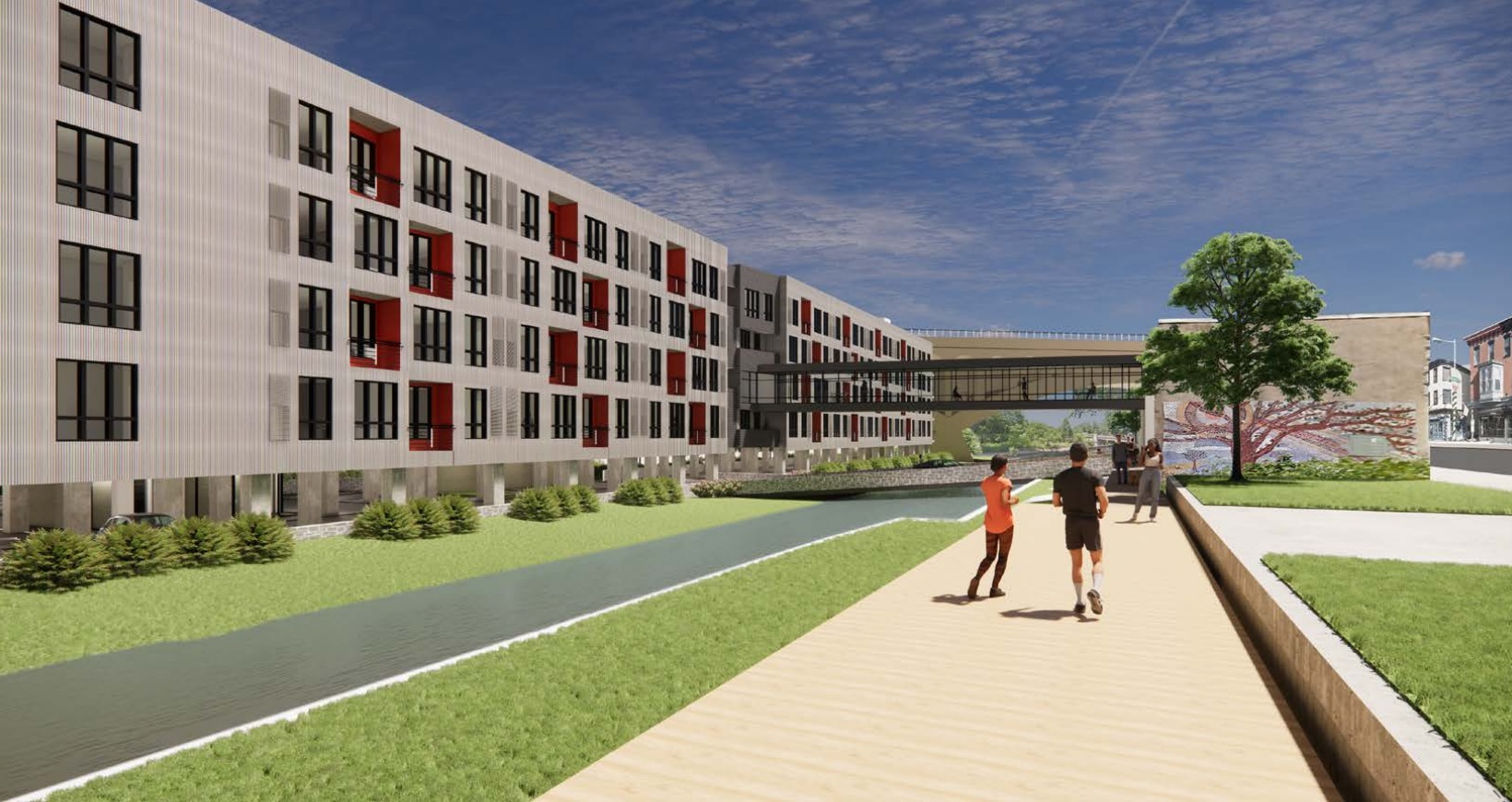 While similar to the previous plans, there have been some slight adjustments to the approach for this project brought to us by ROCK Urban Development. The design from JKRP Architects still consists of two four-story buildings, but with a few key changes from what we knew before. The project now includes a pedestrian pathway three floors above ground level, with a bridge connecting the apartment buildings to each other and another bridge connecting the large building to a new amenity building that is on the mainland, which also will include a 1,000 sqft retail space. Secondly, the unit count has dropped from a total of 243 to the current count of 213. 106 car parking spaces are provided, with parking for an additional 151 bicycles as well. This parking will take up the entire ground floor of the property, since first floor living space is a no-go in this flood plain, which was impacted in a major way by Hurrican Ida last year.