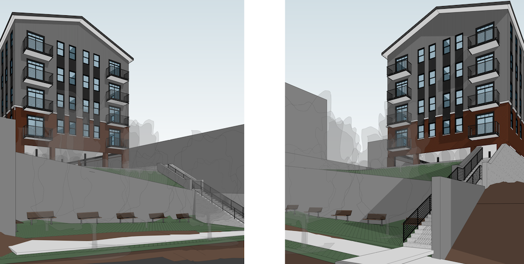A zoning variance, of course! Developers have the property under contract and are proposing an apartment building at the site. This building, if approved, will be built into the large but topographically challenging site, with a very small “basement” level at the grade of the sidewalk, a “first floor” level that’s accessed via a ramp on Pechin Street and a huge staircase on Lauriston Street that also features 24 parking spaces, and then four stories with a total of 36 apartments. Designblendz provided the above renderings, which take on the industrial-turned-residential vibe of the Shurs Lane Apartments, located across the street.