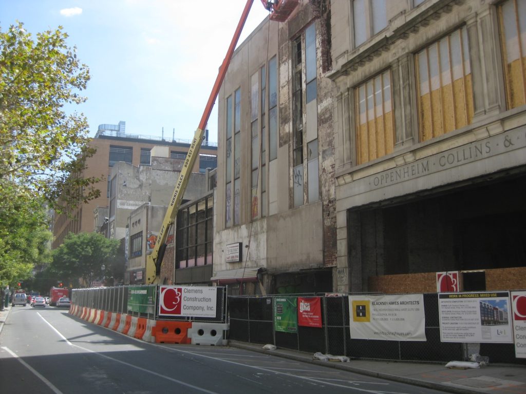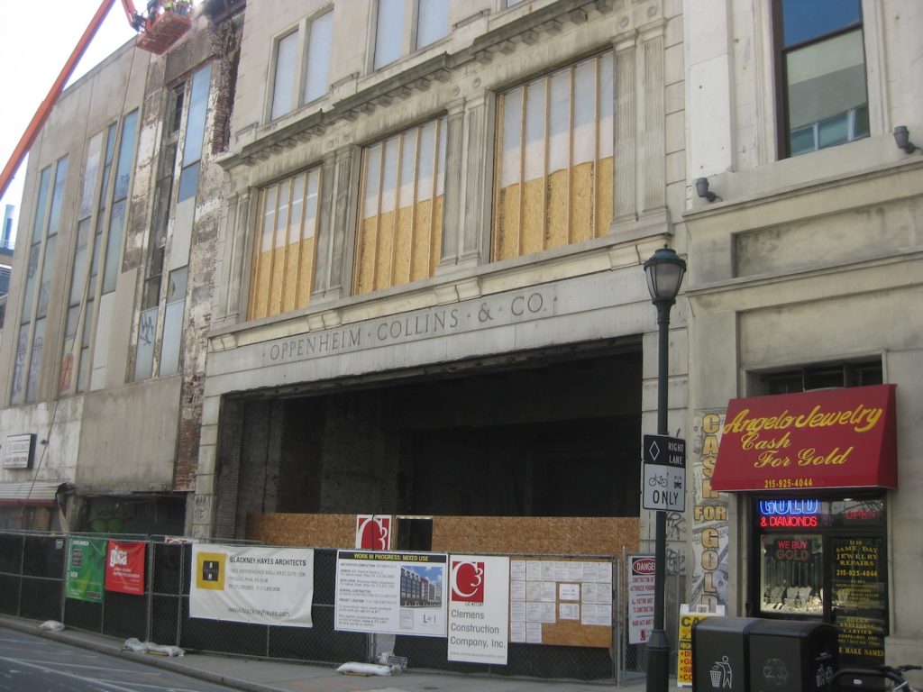 As the months have passed, the project has evolved some and grown eastward. Instead of 80 apartments, the project will now include 115. There will be 90,000 sqft of retail when all is said and done. And another couple buildings, which we previously expected would remain, will soon be demolished. As for the first run of buildings, demolition is underway. At the former Oppenheim Collins building, the graffitti has been cleared off and the building's original sign has been revealed. Here's hoping it remains when the project is over.