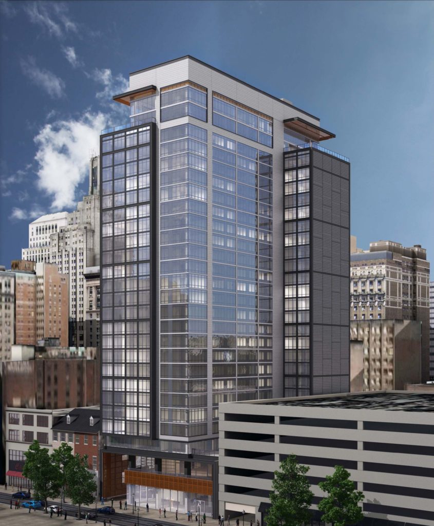 With the market burning hot again, new developers brought their attention to 1213 Walnut St., and at the end of last year we told you that the Goldenberg Group, Hines, and ASB Real Estate Investments broke ground on a collaborative project here. Slightly different from the original plan, this version of the "Fergie Tower" will entail a 26-story building with 322 apartments and over 7,000 sqft of retail space. Design Collective did the architecture, and a few months ago Philly Mag shared an image of how the project will fit in on Sansom Street.
