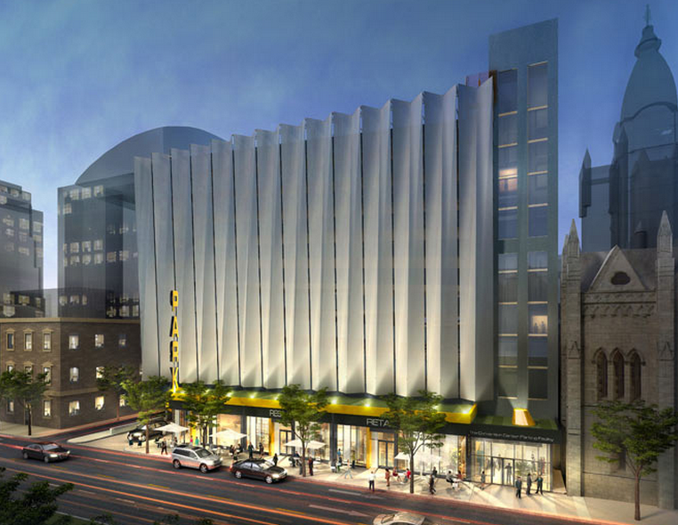 About a year ago, we last brought news to you of a new parking garage rising at 1324-42 Arch St., across from the expanded Convention Center. Over the past eleven months, construction has progressed, and the garage section of the building looks to be nearly complete. Recently, work has been taking place on the commercial spaces that will front Arch Street.