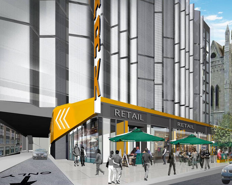 While the 540-spot garage likely fills a need, it still bums us out to see a new construction project in this location that seems to be thinking small. We appreciate the commercial aspect, as well as the inclusion of some green elements like a green roof and electric car charging stations, but we would have been really excited by the addition of some more height, perhaps with residential units above the garage. Considering the height of a few other nearby buildings (including, you know, City Hall), it would have fit right in.