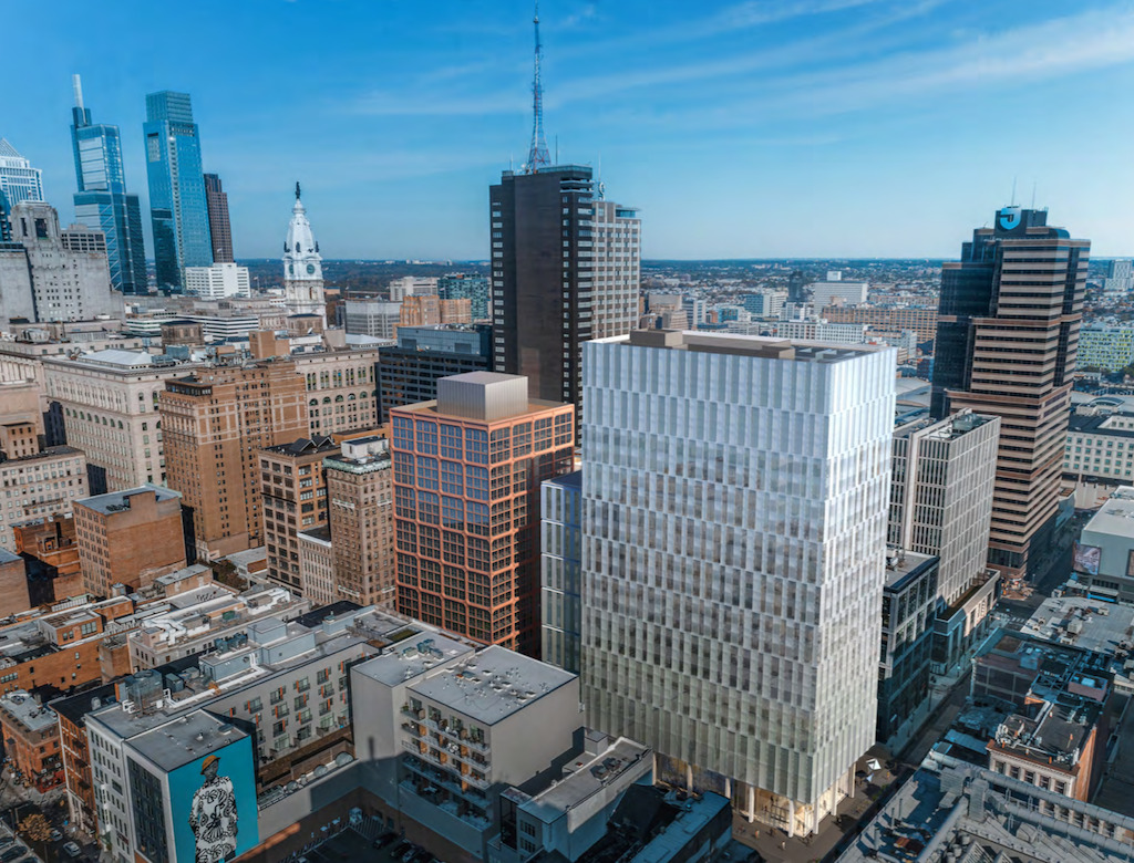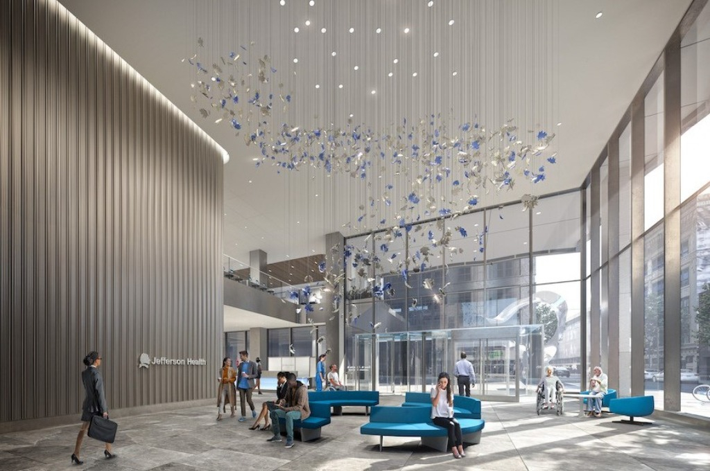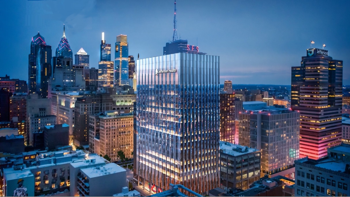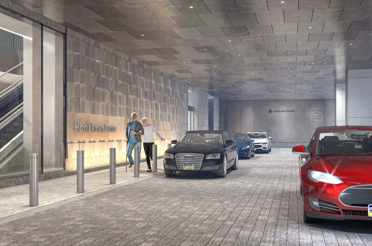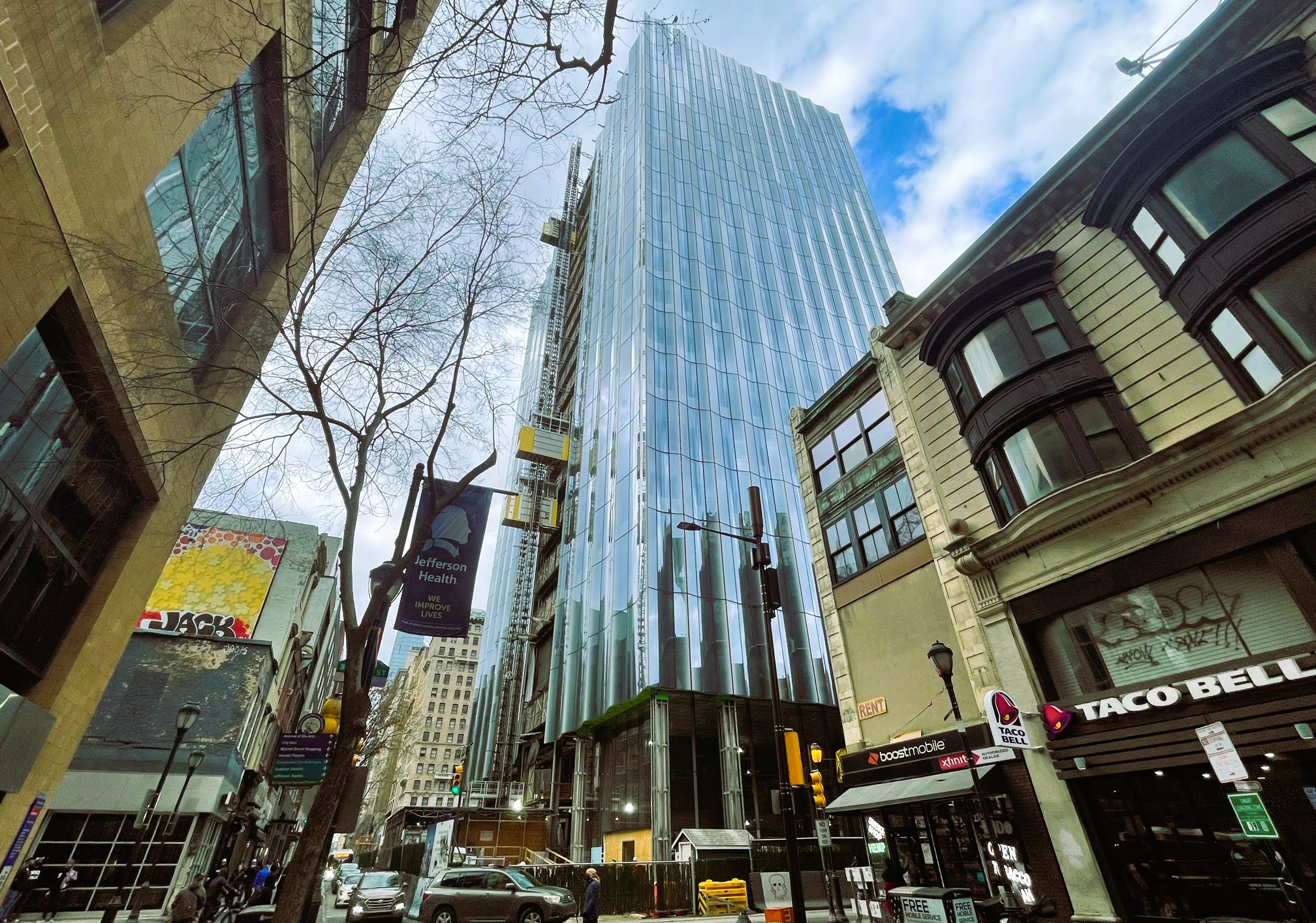 One of the biggest projects in Center City has been on-going for some time as it’s transformed the face of Market East. In fact, the giant East Market project from National Real Estate Development took its name from the neighborhood as a series of low-rise buildings and parking garages have been replaced by a thriving mixed-use neighborhood. Apartments, commercial space, and a hotel are already finished, and the newly-named Honickman Center is the newest addition from Jefferson Health. Formerly a Streamline Moderne parking garage, 1101 Chestnut St. will be a new patient-focused, 20-story facility that will feature state-of-the-art capabilities in the heart of Center City. But today things are nearly wrapped up for this modern tower, which was originally slated to have a residential neighbor on the western side of the site.