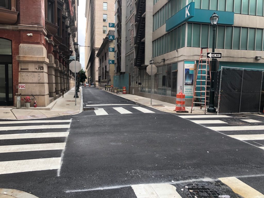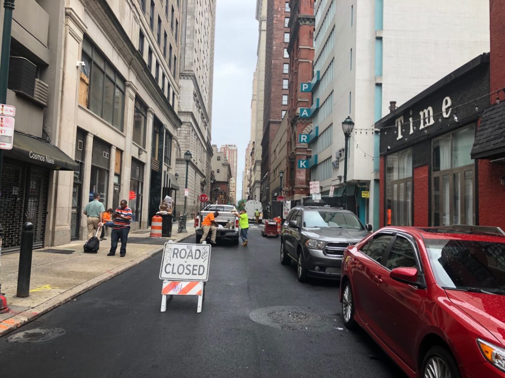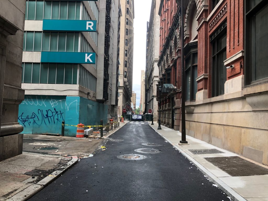 If you’re ever driving through Center City on Chestnut Street and you encounter traffic (so most of the time), a pro move is to take a detour down Juniper Street and drive south until you reach some more manageable traffic patterns. That’s been our strategy for years, but it has been unavailable to us since July 3rd of last year when a water main broke at the intersection of Juniper & Sansom. This shut down the businesses in the immediate area for a couple days and also closed the street to vehicles and pedestrians for much longer. When we checked in on the situation back in March, the intersection was still closed and workers at the site indicated that it wouldn’t reopen until August. Fortunately, the construction proceeded a bit ahead of schedule and the streets will be reopening today. This is obviously terrific news.