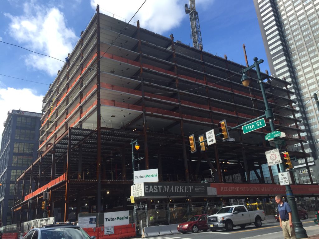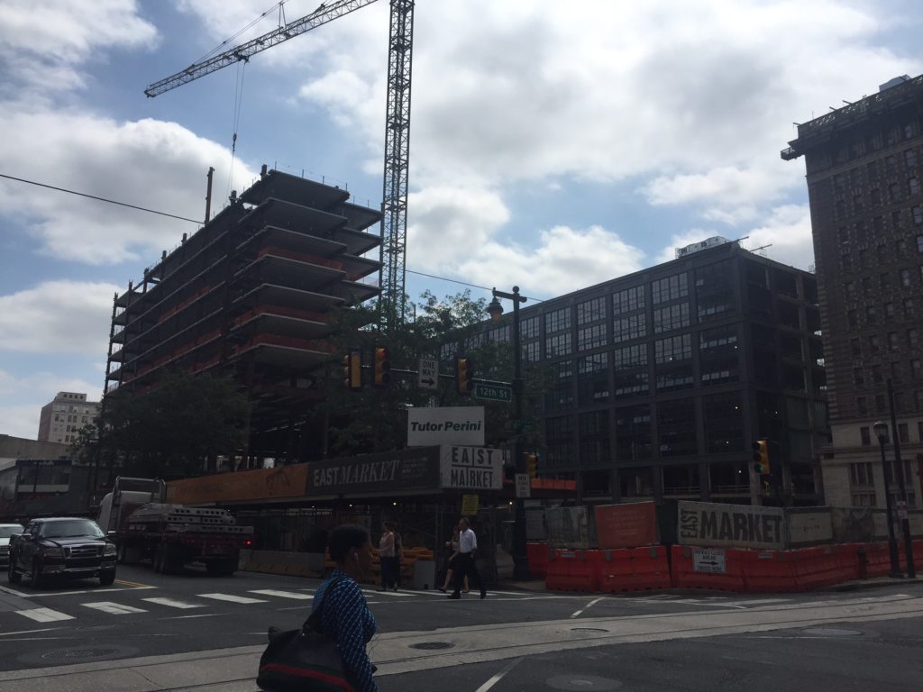We had jury duty last week. We got called in the first group, spent a couple of hours waiting for selection, and then the case was settled and we got to go to lunch. Since we were in Center City, we opted for some tasty Double Knot, and during the walk over we passed the East Market project on the 1100 block of Market Street. When we last visited this project a year ago, it was a large hole in the ground. Times have changed.