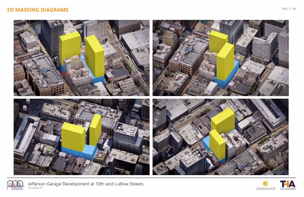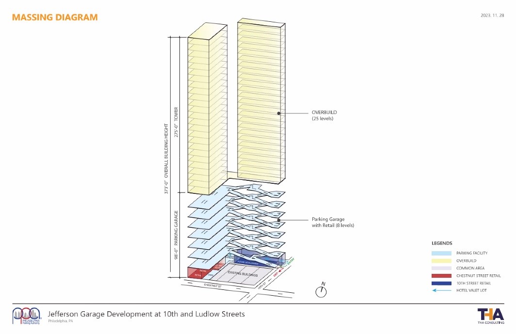 But that’s not all! The pot is sweetened further by two other pieces in the legislation: first, the “mission-oriented” eight-floors of parking would NOT be included in FAR calculations, and this above grade parking would NOT trigger a trip to the ZBA. This would, in effect, allow for a 2400% FAR if you count the parking, basically doubling what was permitted earlier. The site would include retail along Chestnut St. to activate the frontage, while parking for 650 cars would be spread over the rest of the bottom eight floors. The team even provided some massing visuals of what could potentially rise on the property, showcasing what could be another new addition to the skyline.