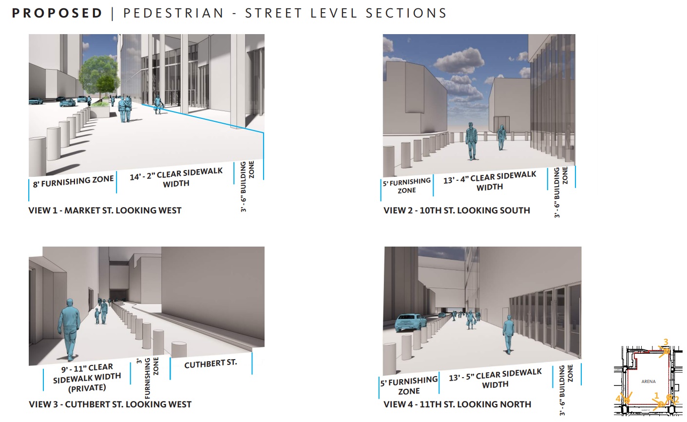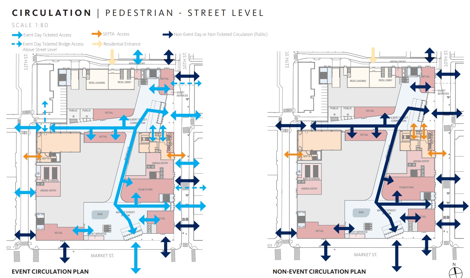 How people will get to a proposed arena has been nearly as contentious as the arena itself. With the current location in a sea of South Philly parking at the sports complex, future attendees would have a new route to run. There are many existing parking lots close by, with plans to help better guide folks to the most convenient lot. Additionally, the transit connectivity would be transformed, with regional rail lines potentially providing direct access to the arena. Pedestrian access to Jefferson Station would also be expanded, with more access points at street level. Bus routes would be impacted, with current stops being moved to allow for easier game day walking flow. A bike study was also included, but we can’t imagine many folks will be biking to the game without safe and easy storage.