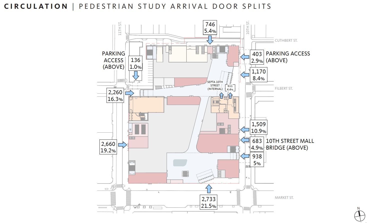 We knew that the footprint was to be expanded here to accommodate the arena, with a proposal to eliminate part of Filbert St. to make space. The residential tower – for which we still have very little information – would sit on the north part of the property on the site of the former Greyhound station. Sidewalks would be expanded, and new bollards placed to allow for greater pedestrian flow around the arena, with all loading taking place via an underground dock. Numbers from a pedestrian study are also included, showing the expected use percentages for each of the future entrances.