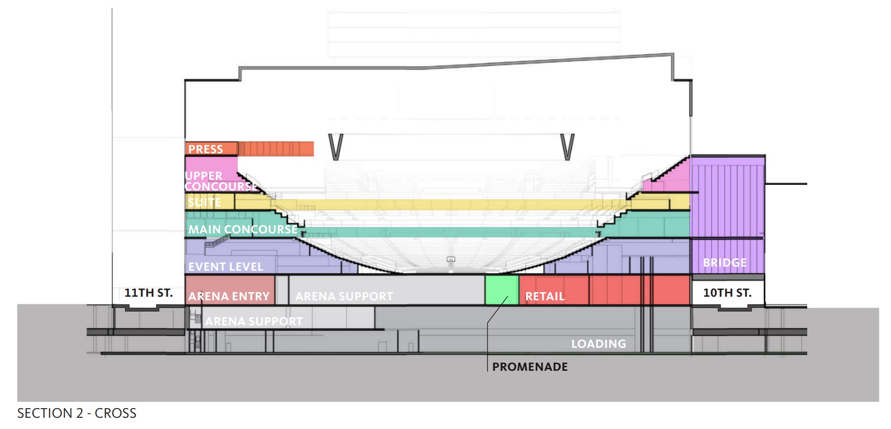 The overall program here is much the same as has been proposed was in the past, just with more details. Pedestrian bridges would connect the arena to the remaining mall and parking, while small-scaled ground-level retail and improved signage and wayfinding would provide an improved experience on gameday or otherwise. An atrium at 10th & Market would provide a dramatic entry point for those going to the game or doing some shopping, with the arena operations taking up the interior portions of the ground level.