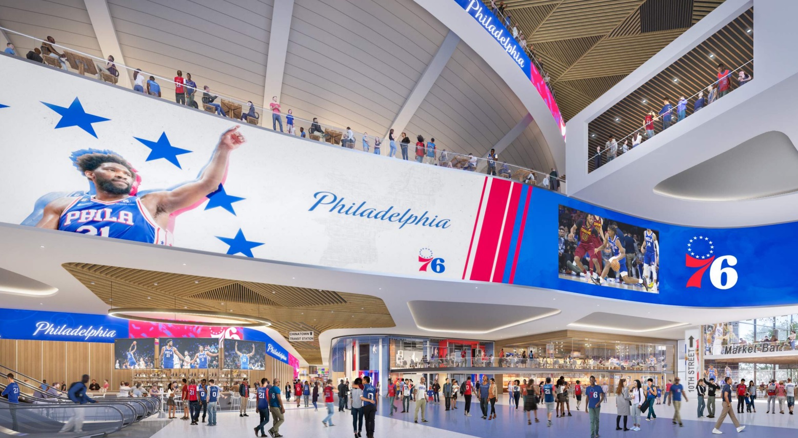 At last! This one is pretty straightforward, as the new master plans provided some updated visuals of what the future could hold. Curved lines and warm woods are used throughout, creating a surprisingly hygge vibe to a sexy, new, downtown basketball arena. Plenty of video engagement will be included inside and out, giving a very Sixers feel to the area.