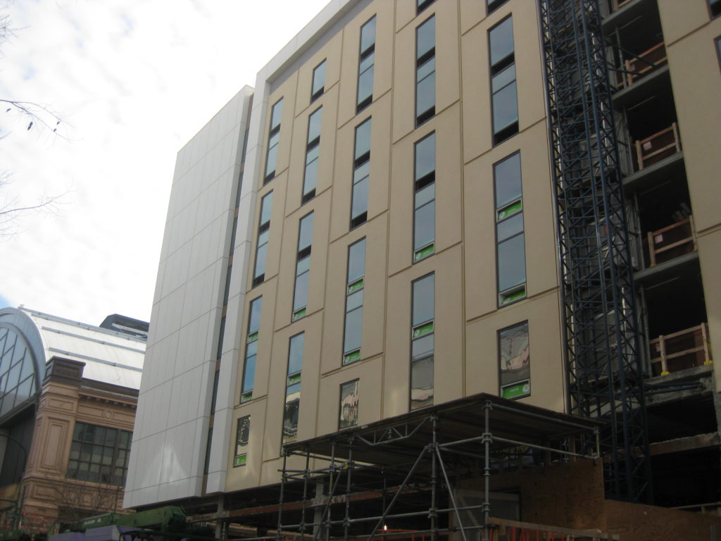 Unfortunately, as the hotel has risen from the ground, we’ve discovered that its appearance leaves a lot to be desired. Especially with a number or ornate buildings immediately to the west, and the historic Reading Terminal right across the street, the new building really sticks out, looking like a bland cube that just dropped out of the sky.