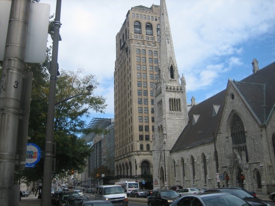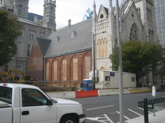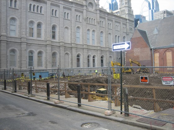 Way back in March, we wrote about a planned 530-car parking garage at 1324-42 Arch St., right across the street from the newly expanded convention center. The developers, Realen Properties, were facing some understandable opposition from next-door neighbor Arch Street United Methodist Church, but Realen was apparently able to address their neighbor’s concerns. Last week, we were in that area and noticed trailers, heavy equipment, and a hole being dug for a foundation.