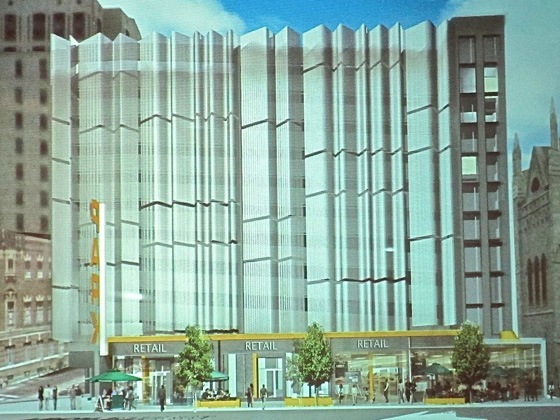 With the church windows boarded up for protection, the parking garage seems to finally be moving along. In our earlier post, we showed a rendering for the garage. We imagine that the specs have changed somewhat, but Realen isn’t sharing anything with us at the moment. Here’s another look at that rendering:
