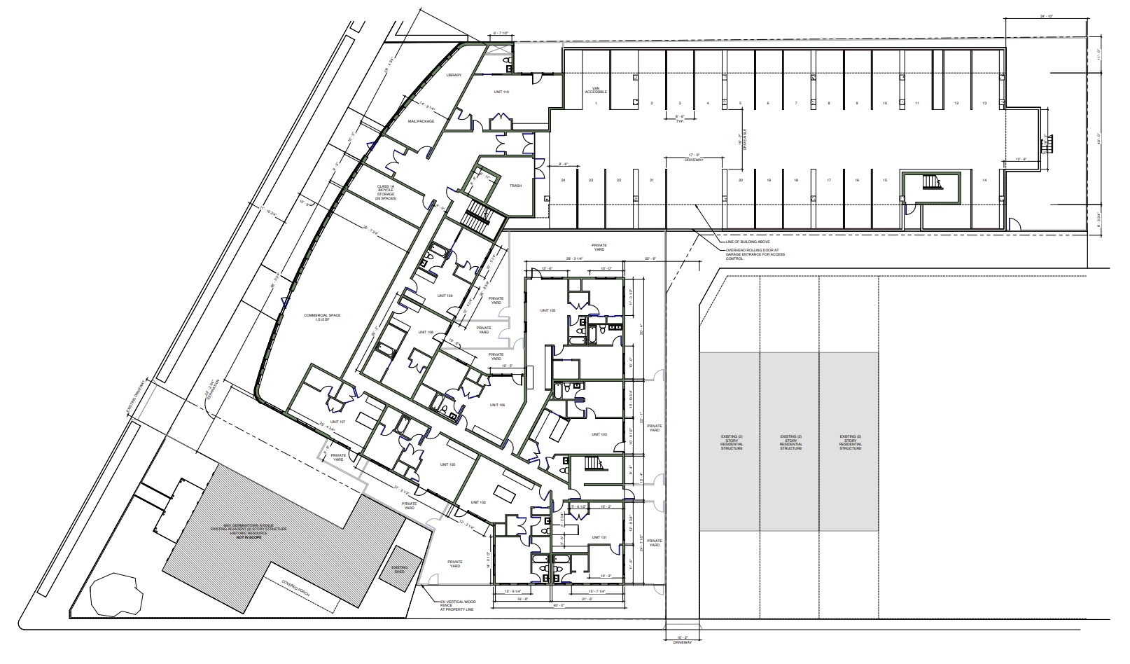 First, from a layout perspective: the unit count, commercial space, and parking are all to remain the same (save for a slight reduction to the commercial size), along with the four floors. The shape of the building is adjusted slightly, stepping back further from the house than before, while providing a rounded edge that also includes more windows on the party wall. With a few tweaks to the unit layout, the count remains the same, providing more space for the Gorgas abode to breathe in the leafy air.