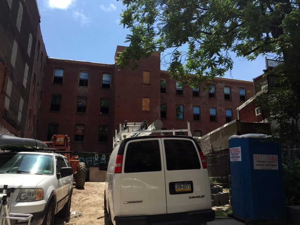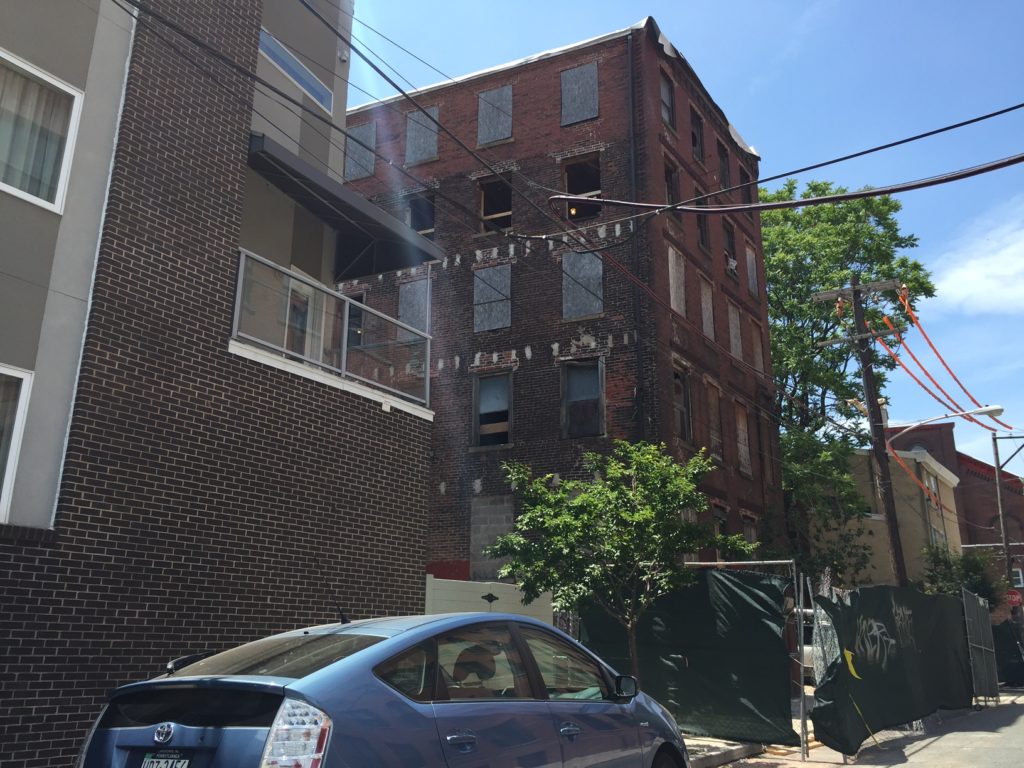 Back in the day, the Wilson & Sons carpet binding factory covered a large parcel just south of Cambridge Street, between Orianna and 4th Streets. Some time after the factory shut down, the rear portion on Orianna Street was demolished and just a few years ago, developers built a row of homes. These homes were nice enough, but the people living there had to deal with the ghost of the old factory in their backyards. But that's finally changing.
