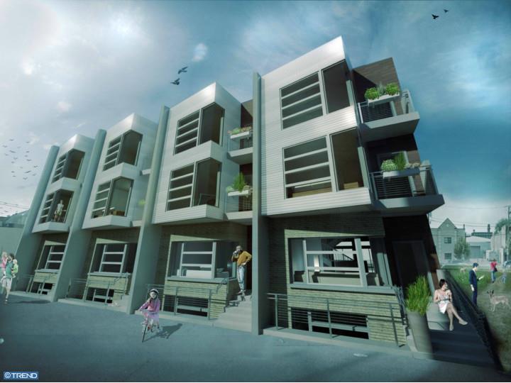 When the project is done, there will be four new homes fronting 3rd Street and four new homes fronting Bodine Street. The homes will all have rear parking, accessed via a drive-aisle on 3rd Street. Cars will come in and out on 3rd Street, which might be the reason the Bodine Street homes are the first phase under construction. Check out the renderings: