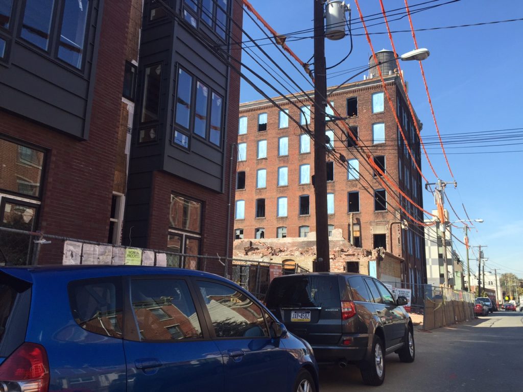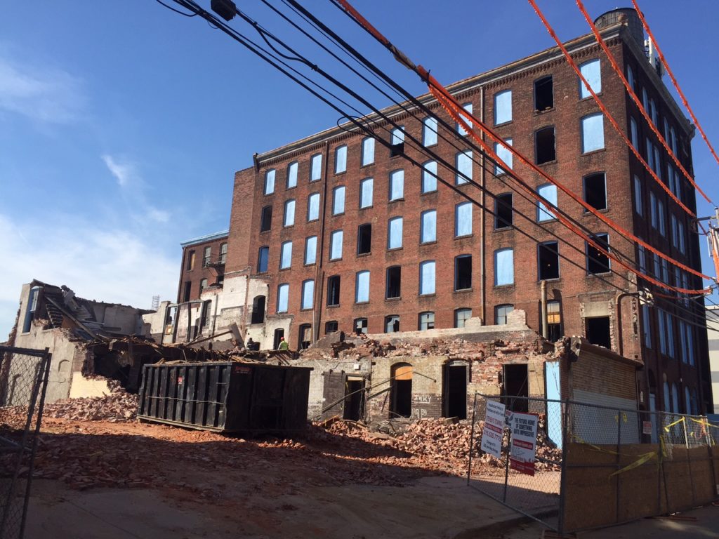 By the winter of 2014, developers had purchased the building and were going back and forth with the NLNA on a complicated project that involved some demolition, some adaptive reuse, and the construction of a bunch of new homes. We checked in about six months ago, and several homes were under construction on 5th Street as part of the project from PRDC Properties, and some demolition was getting underway on Fairmount Avenue. When we passed by last week, we discovered that several smaller buildings on Fairmount were going or gone. Interior demolition appears to be underway inside the six-story building.