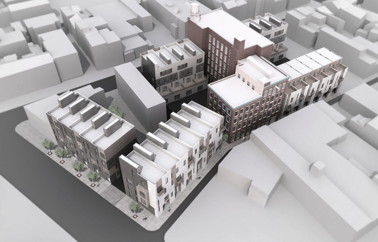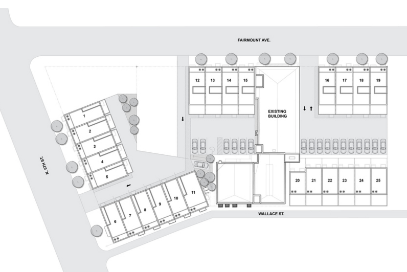 A reminder, this project will ultimately include twenty five new homes on Fairmount Avenue, Wallace Street, and 5th Street. In addition, the large building on Fairmount Avenue and a slightly smaller building on Wallace Street are being converted to residential use, with 41 apartments on the horizon. The project holds a great deal of interest to us not only because of the fact that the developers are reusing an awesome old building, but also because they've been able to cleverly lay out a complex project on an oddly shaped lot. Here, check out what we mean: