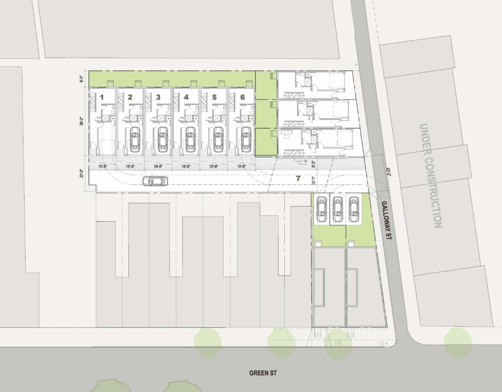 But somewhere along the line, the developers found a way to add seven more units to the project. Check out the site plan, which shows six additional homes immediately to the west of the three homes on Galloway, and a seventh unit carriage house floating above a drive-aisle: