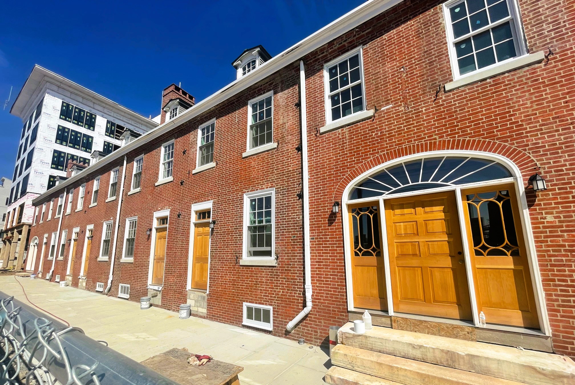 In case you’ve been mixed up by all of the development in the area, let’s provide a quick refresher since our last official visit in June 2022: Saxum Real Estate has paired with JKRP Architects to bring a two-building, 466-unit, mixed-use project to the block. While the two seven-story buildings are the most prominent parts of the project, it will also entail the refurbishment of the historic rowhomes from the 1830s that sit on the southern side of the site. When we went to check out progress, we were thrilled to see these old buildings getting some love as the western-most building rises immediately next door. About 15K sqft of retail space will also be included here in the center of the site, creating a retail-lined pedestrian path where Canal Street once ran.