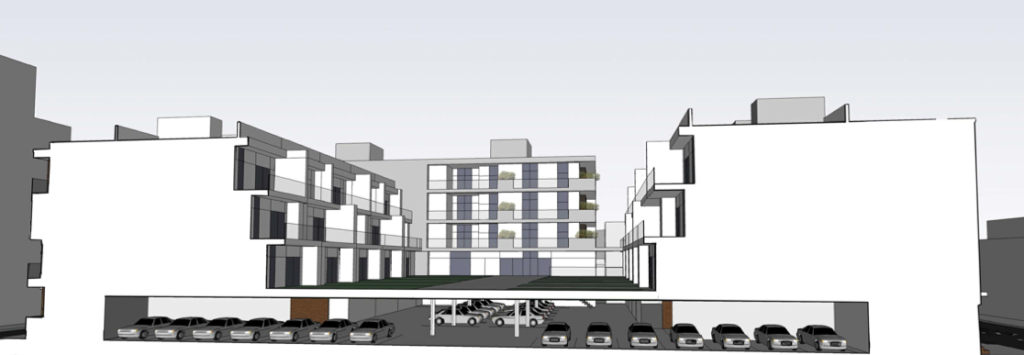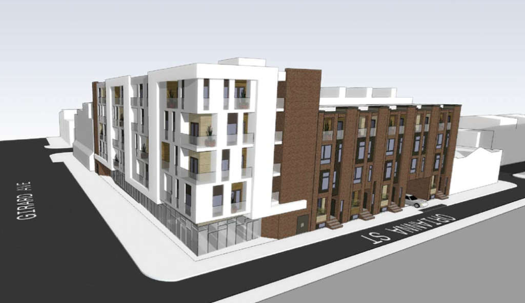 The project will mean the demolition of all the buildings currently on the site, and the construction of a five story building fronting Girard Avenue with twenty apartments and 3,100 sqft of commercial space. On 3rd Street and Orianna Street, the building will be flanked by four-story triplexes which will stand in architectural contrast to the Girard building. Thirty-six parking spots are included in the project, though they'll be covered by a second floor courtyard that's accessible to residents. KJO Architecture did the design work on the project- check out these renderings: