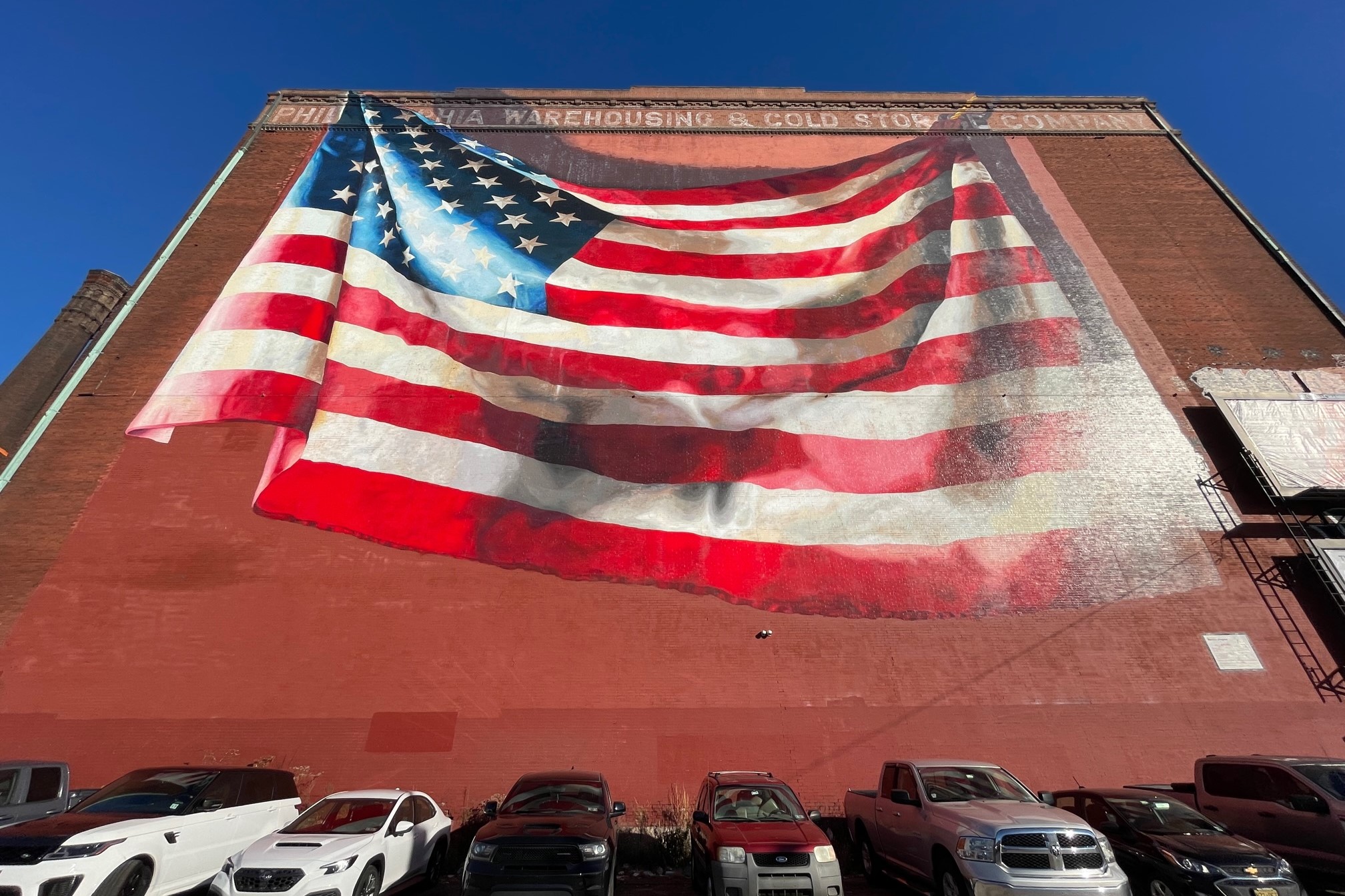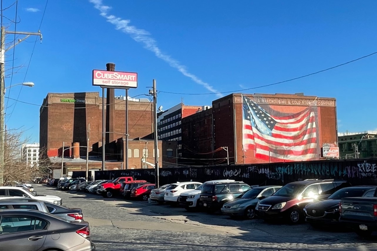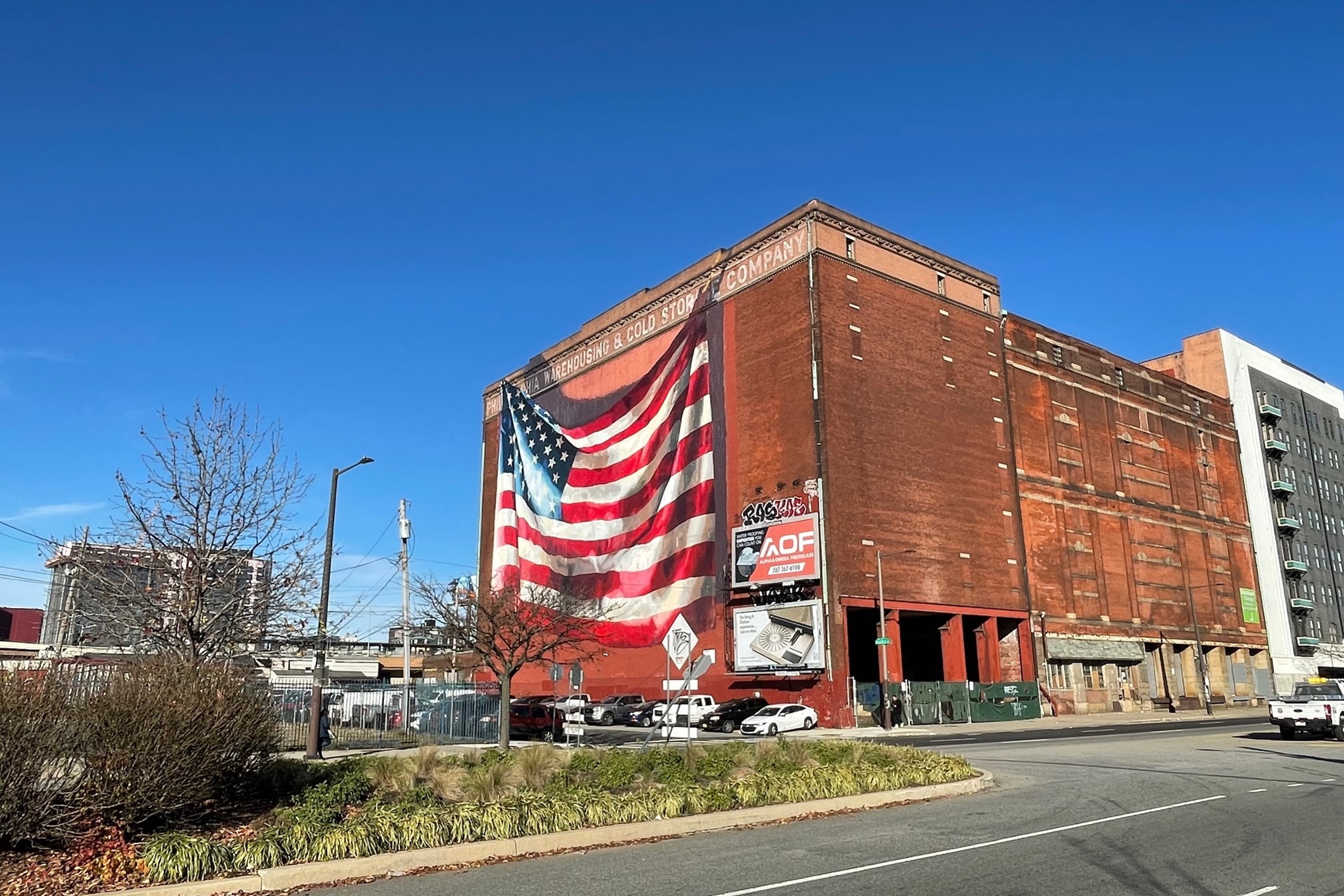 It feels like only yesterday that we made our way to 500. N Columbus Blvd. to check out plans for a potential adaptive-reuse of part of this historically protected complex. Most recently known for the massive American flag mural by Meg Sallgman Studio, this windowless building received zoning permits for a 96-unit conversion, seemingly meaning the mural would be no more. This sits right near the new intercity bus stop, which was busy on this chilly December morning.