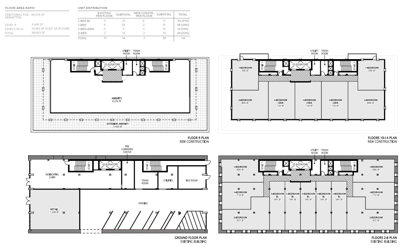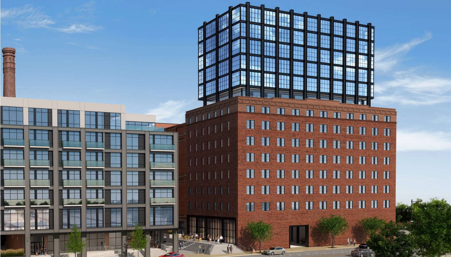 But lo! Thanks to plans just posted for an upcoming Historical Commission meeting, we now know that something even bigger is in store here. A five-story addition is proposed for the top of Building B, with the mural to be repositioned to make way for over 100 new window openings. The proposed unit count jumps up to 112, with the 65′ addition bringing the total size to 14 floors and 169′ in height. A small number of ground floor parking spaces will be included, along with a commercial space. The design from JKRP Architects is industrial modern, with Morris Adjmi Architect’s Wythe Hotel in Brooklyn serving as gorgeous inspiration for the renovation and addition.