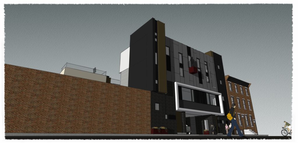 Project rendering. Four more homes will be in the rear. One-story building pictured in the rendering has been demolished, as you've probably noticed.