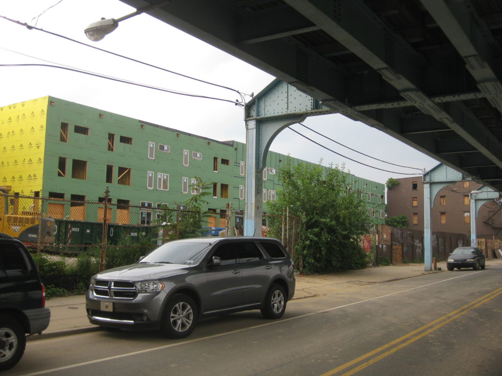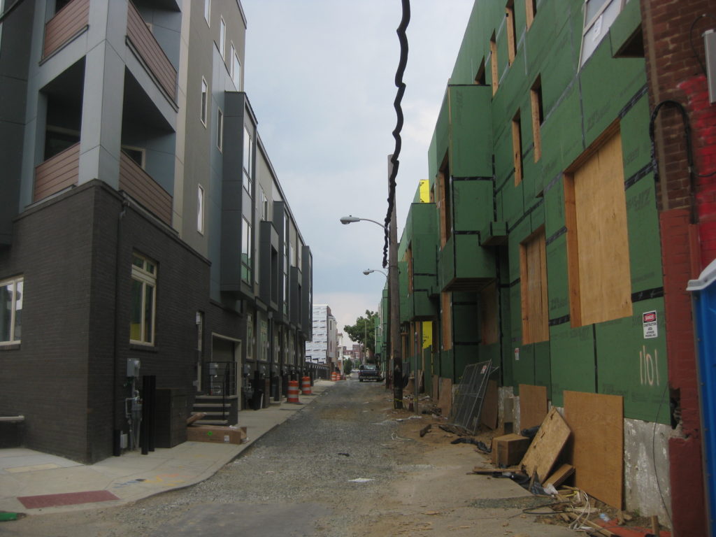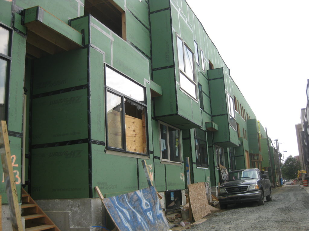 Returning to this block six months later, things are looking a little different. Though we confess we didn’t count, we can tell you that over half of the thirty homes involved in this project have been framed out and sheathed. From what we understand, JKR Partners did the design work for the project as they did for the homes across the street. Looking at the NLNA meeting minutes from earlier this year, the project will also include two-story buildings on Front Street which will have retail offerings. Perhaps those will be part of a second phase, since we don’t seem ’em yet.
