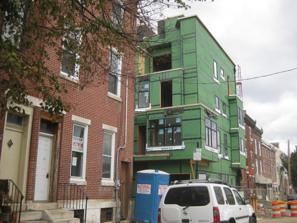 Up the street, three new homes are under construction at 1001-05 New Market St., a former vacant lot. We shared this project before as well, though it was at that time before construction got underway. According to the project website, these four-story homes will have 3 bedrooms, 2.5 bathrooms, parking, and green roofs. They look a little on the skinny side, but we have no doubt they'll find buyers in short order. In this neighborhood, new construction just seems to be flying off the shelf.