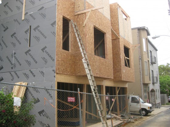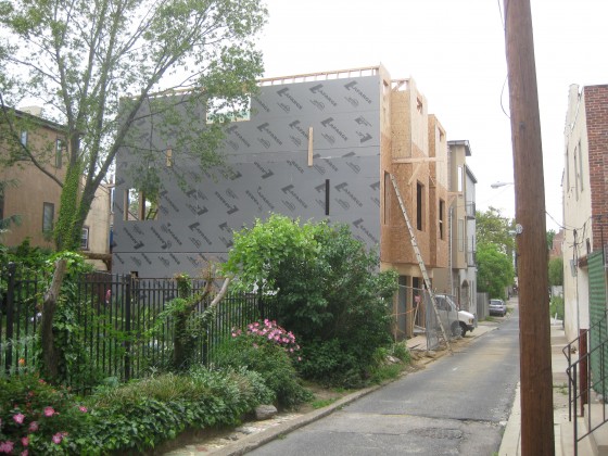 We were in the neighborhood today, skulking around the less-traveled streets, and stumbled upon these two homes, currently under construction in Northern Liberties. Located at 924-26 N Leithgow St., these new homes are immediately adjacent to the Seedy Acres Community Garden.
