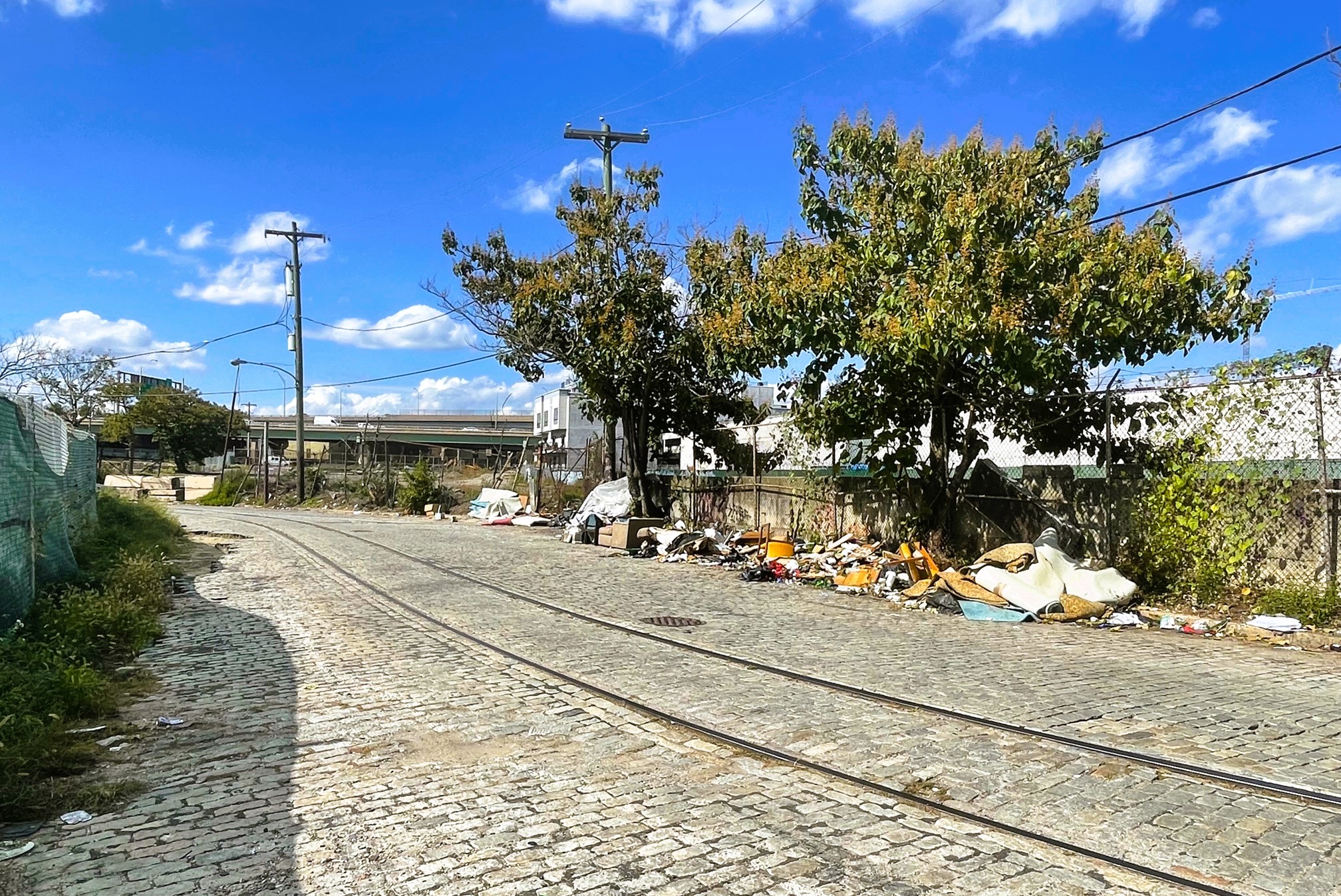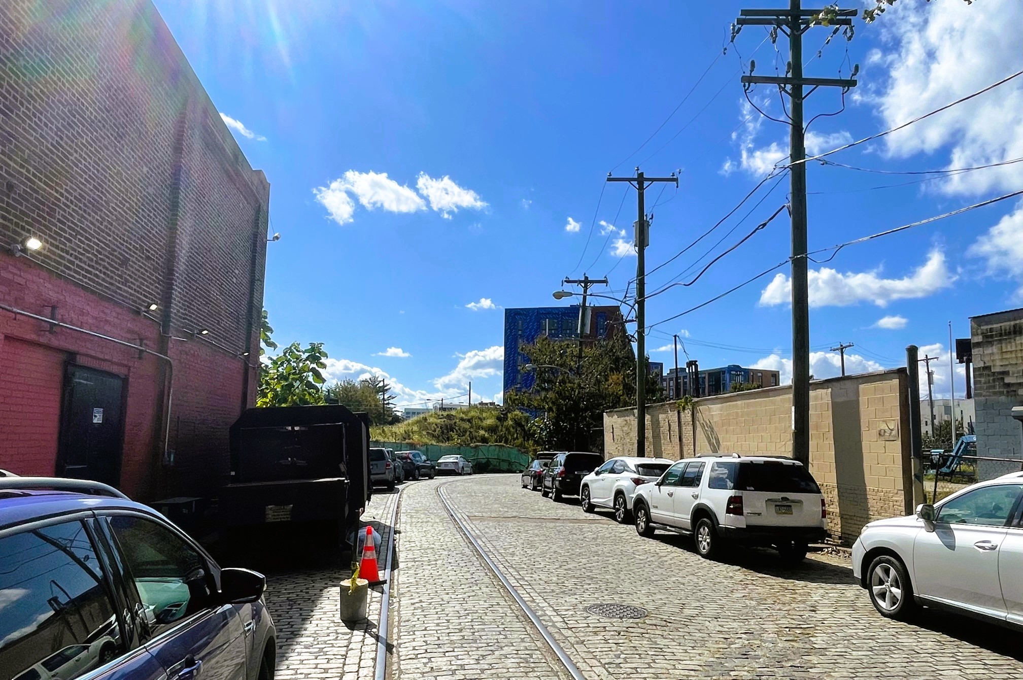 While we understand the sentiment here and are always fond of optimizing the street presence and usability of every morsel of land possible, we think this might be a bit of an overreach. The north side of Canal St. was pitched as an entryway to a meandering, walkable street, lined with cafes and pedestrians. The reality of the situation is that this entryway is barely navigable, with no sidewalks and illegal dumping more prevalent than other passersby. After pushing past the aromatic dumpster of the meat-packing operation next door, the entire NW side of the street is a fenced-off empty lot – hardly a welcoming sight no matter what sort of retail enticements might beckon.