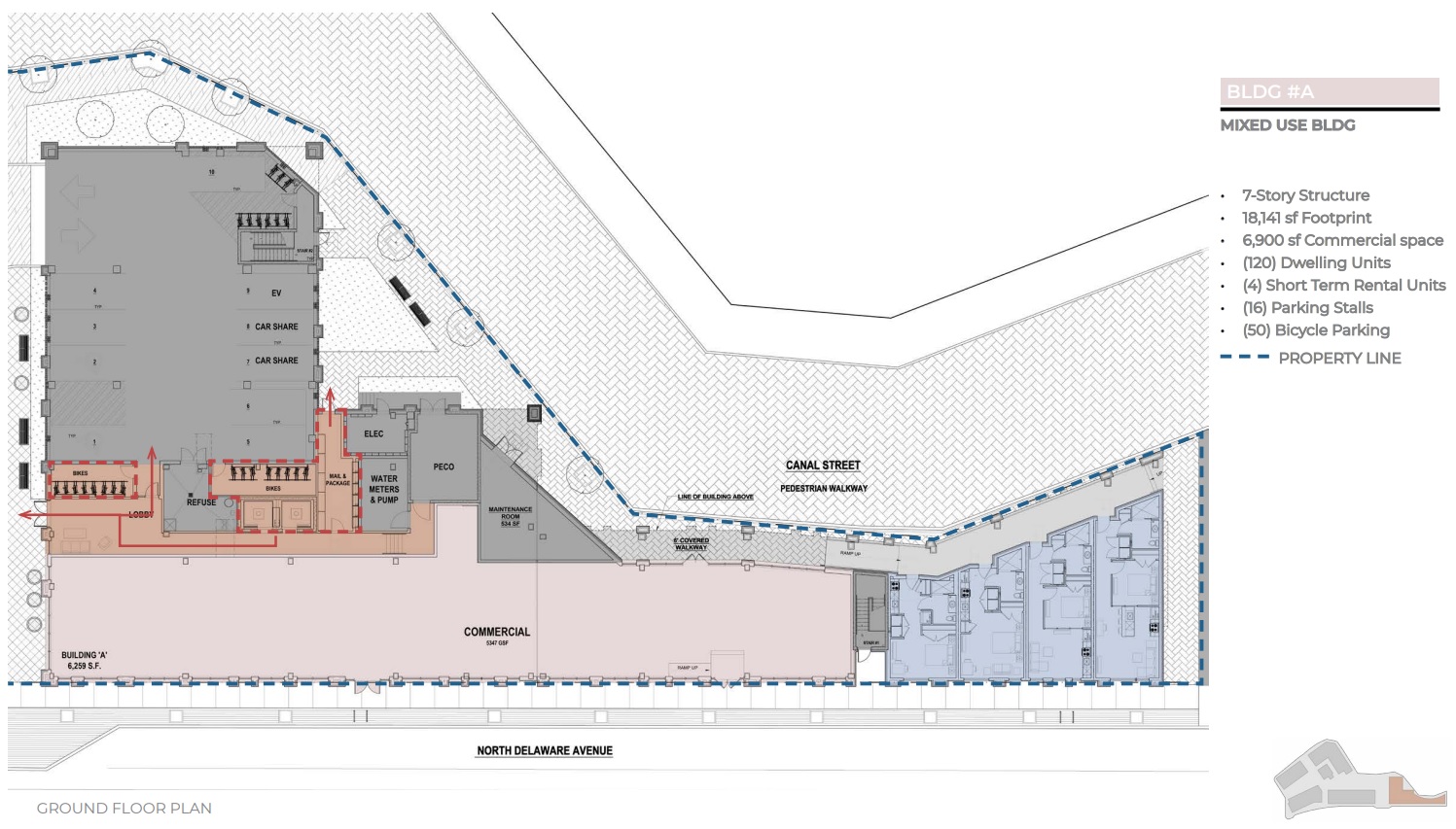 So much is taking place in the city from a development standpoint that sometimes we need to make a quick return visit to check on a project we recently covered, as the pace of development news can be faster than Trae Turner stretching a gapper into a triple. For 970 N. Delaware Ave., we were here only a few weeks ago to admire the progress of the street wall that was rising on the west side of the easternmost street in the neighborhood. Since then, updated plans have been presented to the Civic Design Review for a residential addition that would add several stories to the plans for the northern-most building in the development. Let’s refamiliarize ourselves with the layout before diving into the details.