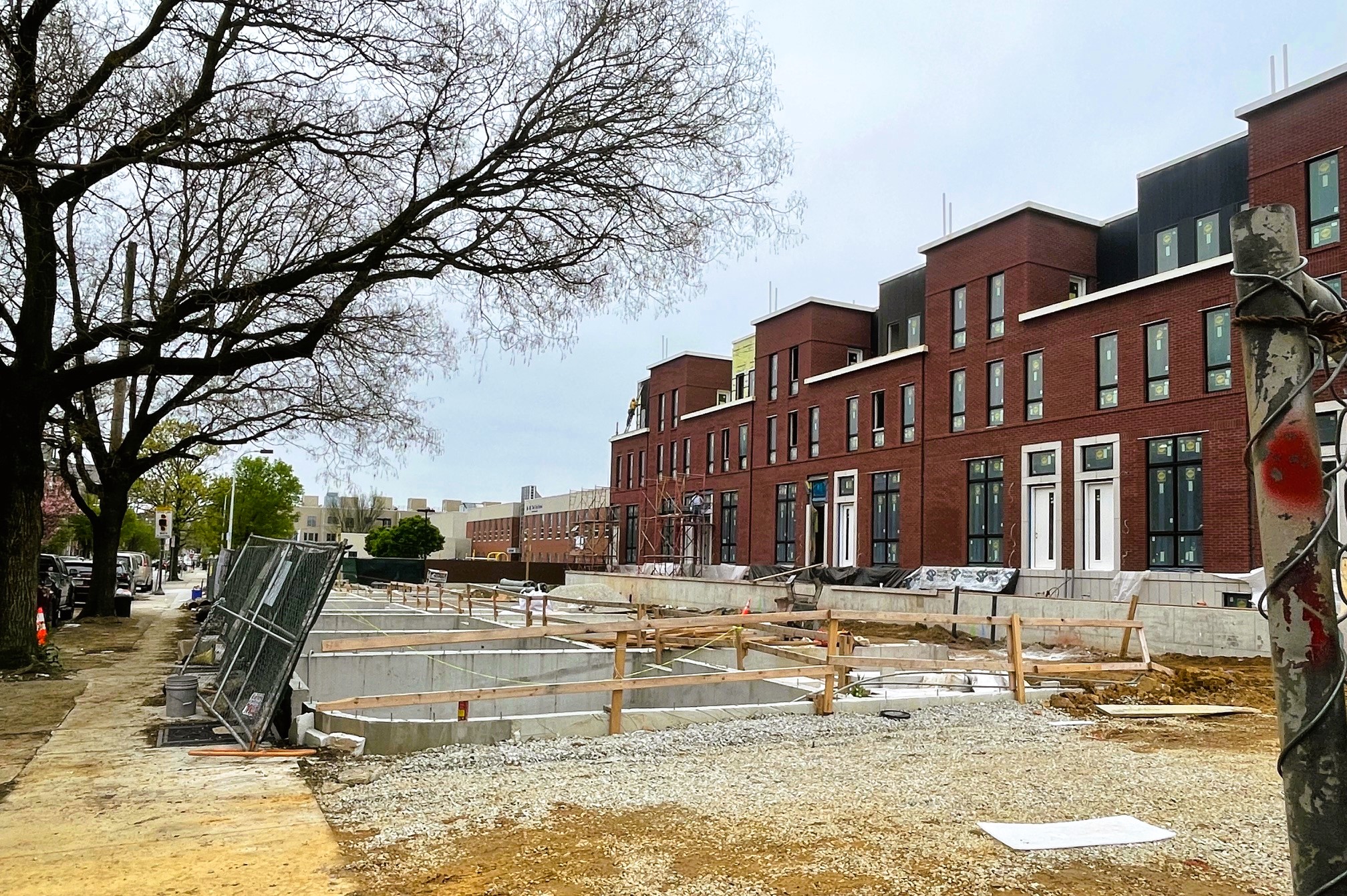 While renderings and diagrams are nice, there’s nothing like seeing the real thing. The site was plenty busy when we stopped by, with crews making progress across the property. The Marshall St. side is finished, with units already occupied. Along the 6th St. side, things aren’t as far along, but foundations are poured, meaning we could see vertical progress start here soon.