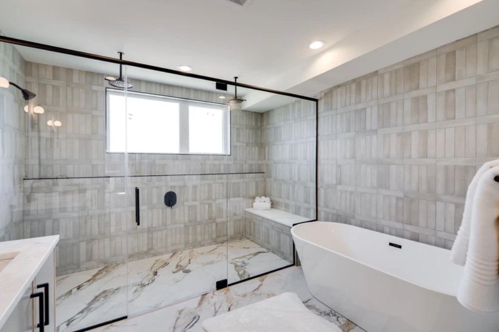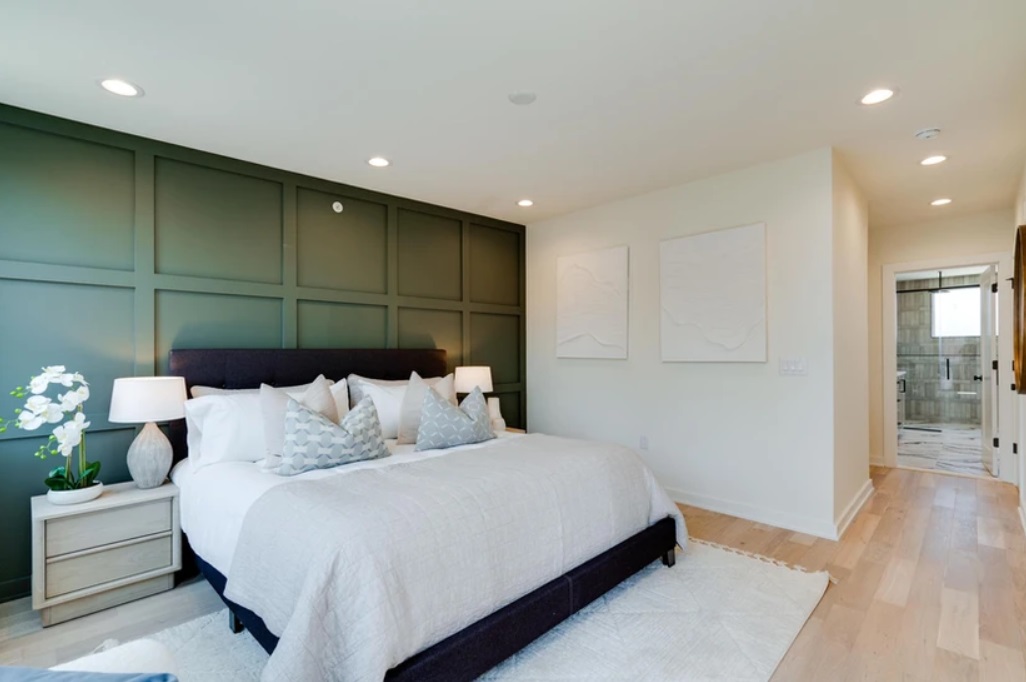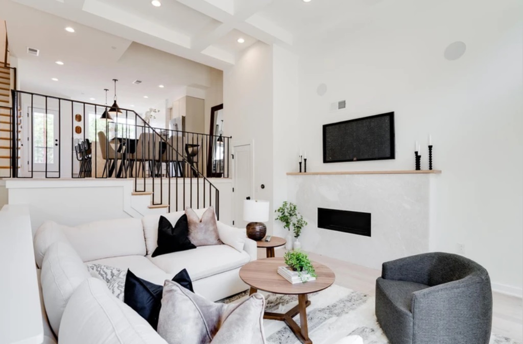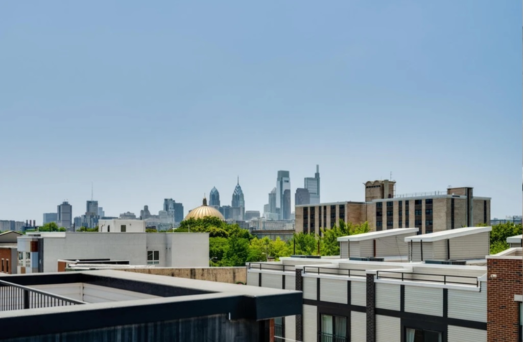 The interiors here are bright and open, with sunken, double-height living room paired with an almost Shaker-styled kitchen. The bedrooms and bathrooms keep the calm but moody tone, with just a hint of Craftsman-inspired finishes and materials. Along with the two car garages on the ground floor, each home is topped with a roof deck with unobstructed Center City views.