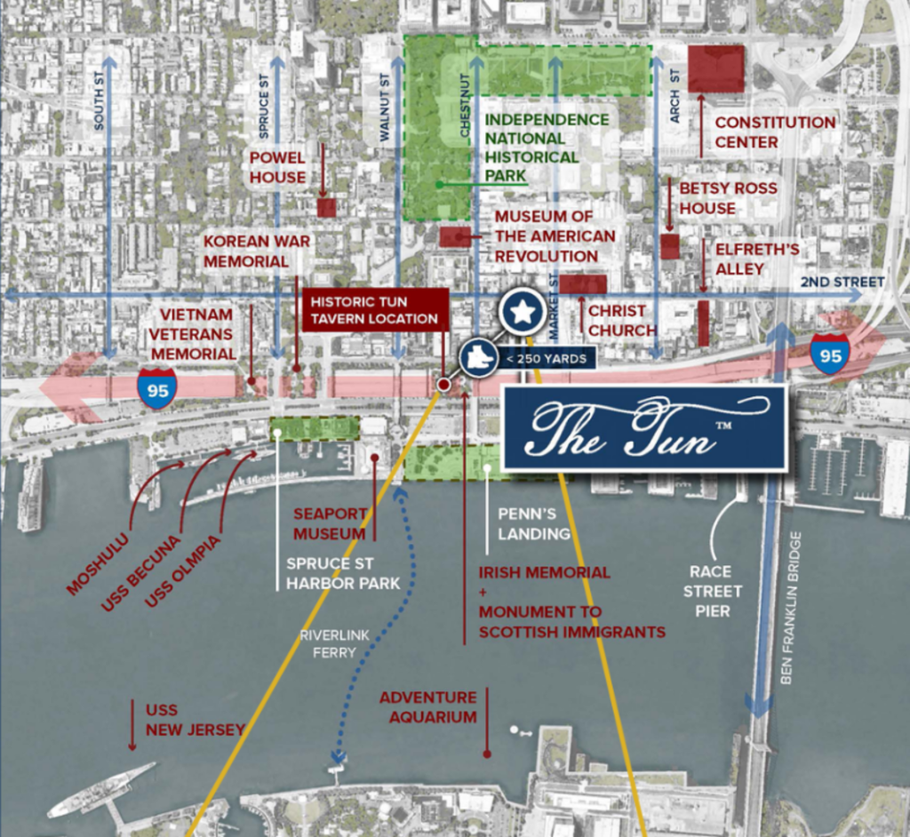 The project, known as The Tun™, will include three floors, an outdoor courtyard, and 170 seats, and will have a look that resembles buildings of the 17th and 18th centuries. There will, by definition, be some creative license in the design – not only are there no photographs of the original tavern, but there are not even any drawings that were made while the building was still standing. Perfect historical accuracy doesn’t seem terribly important here, given that the new building will be a couple blocks away from the original location. This is necessary, since the original location got buried by I-95.