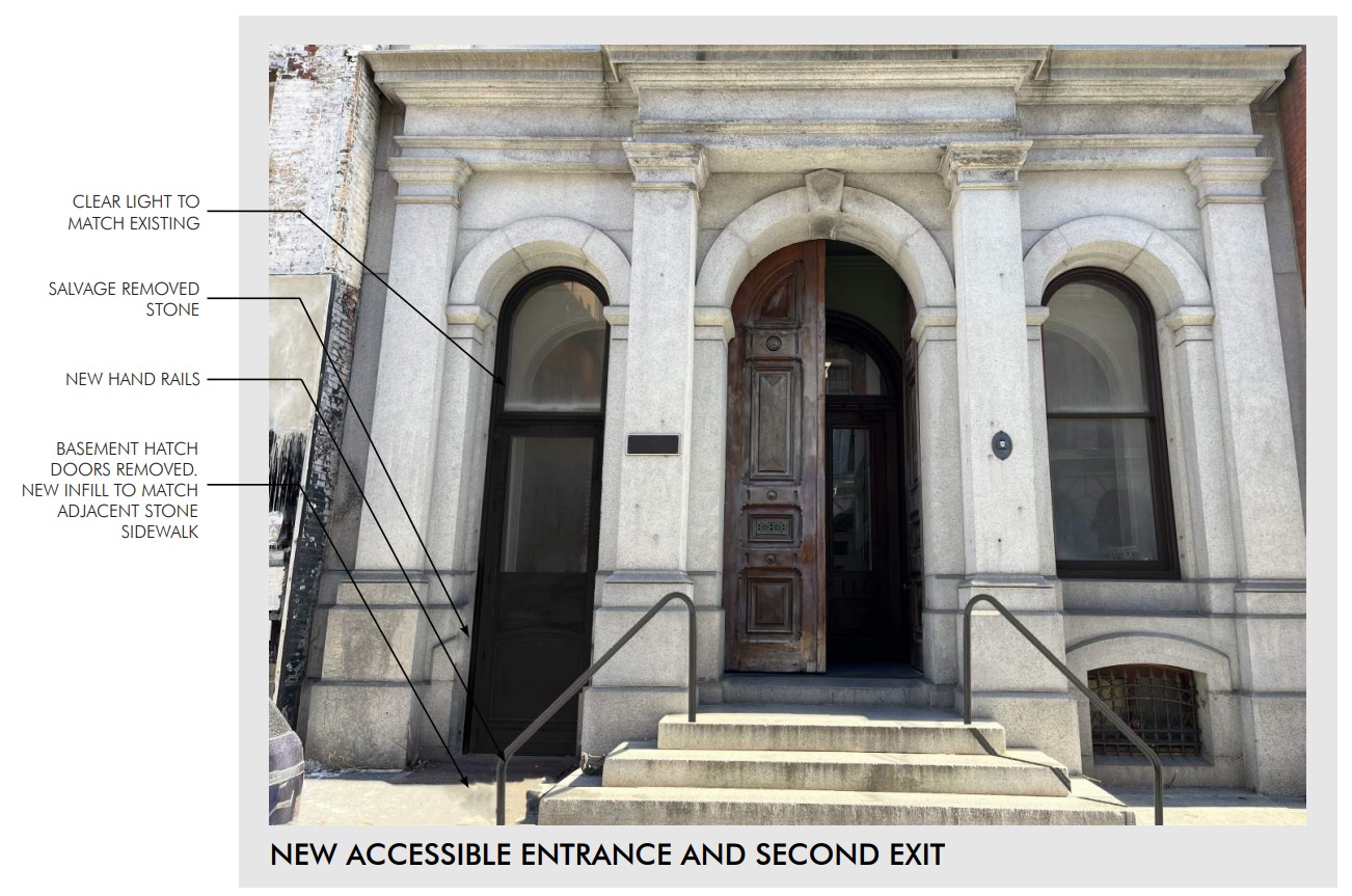 The second sign was one that was a bit more administrative: an orange notice mentioning a Zoning Board of Adjustments meeting, which was taking place on that very day. This zoning notice was for a variance to allow for “THE CHANGE OF USE TO ASSEMBLY AND ENTERTAINMENT,” which seemingly aligns with this most recent arts-focused usage. And as this building is historically protected, plans for an updated entryway designed by Heckendorn Shiles Architects had to be given the OK by the Historical Commission, which did so unanimously last spring, allowing for the accessible entrance as required by code.