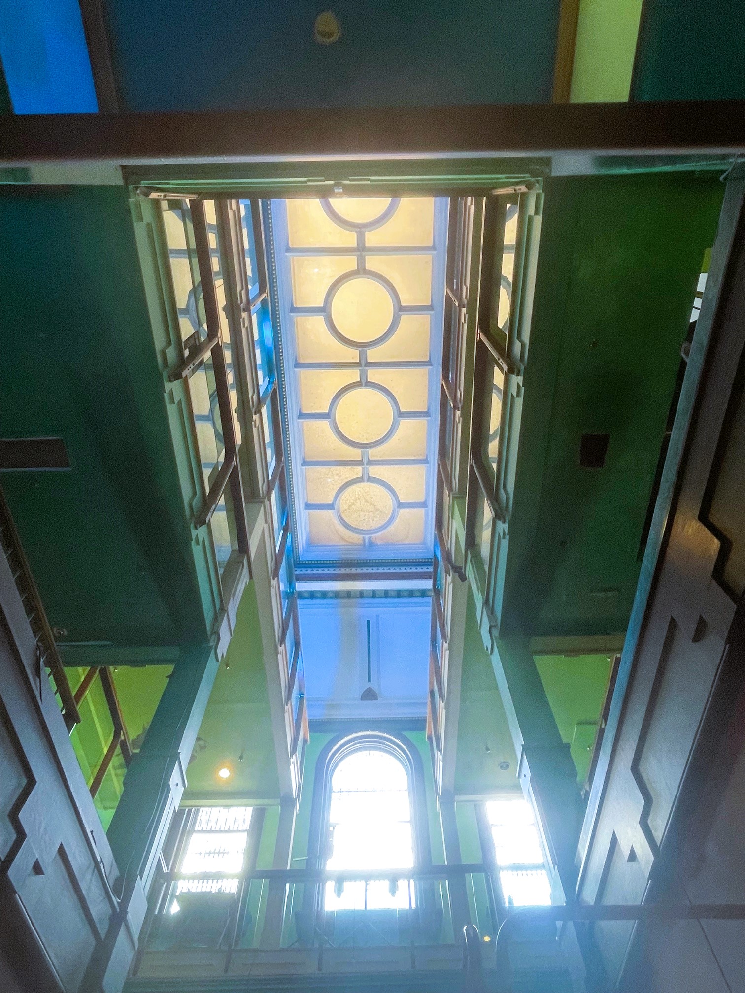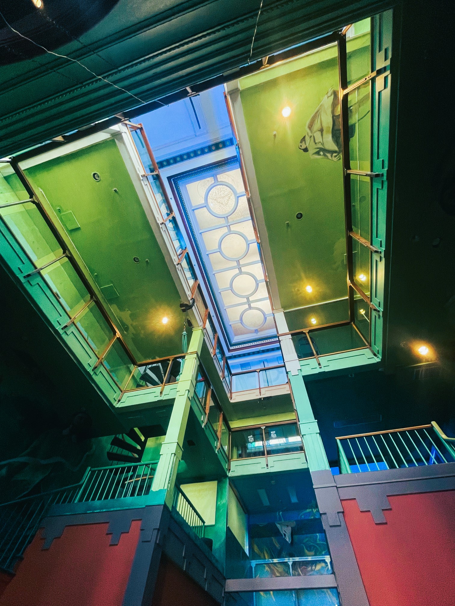 Another look up from the back of the first floor, showcasing the upper-level balconies